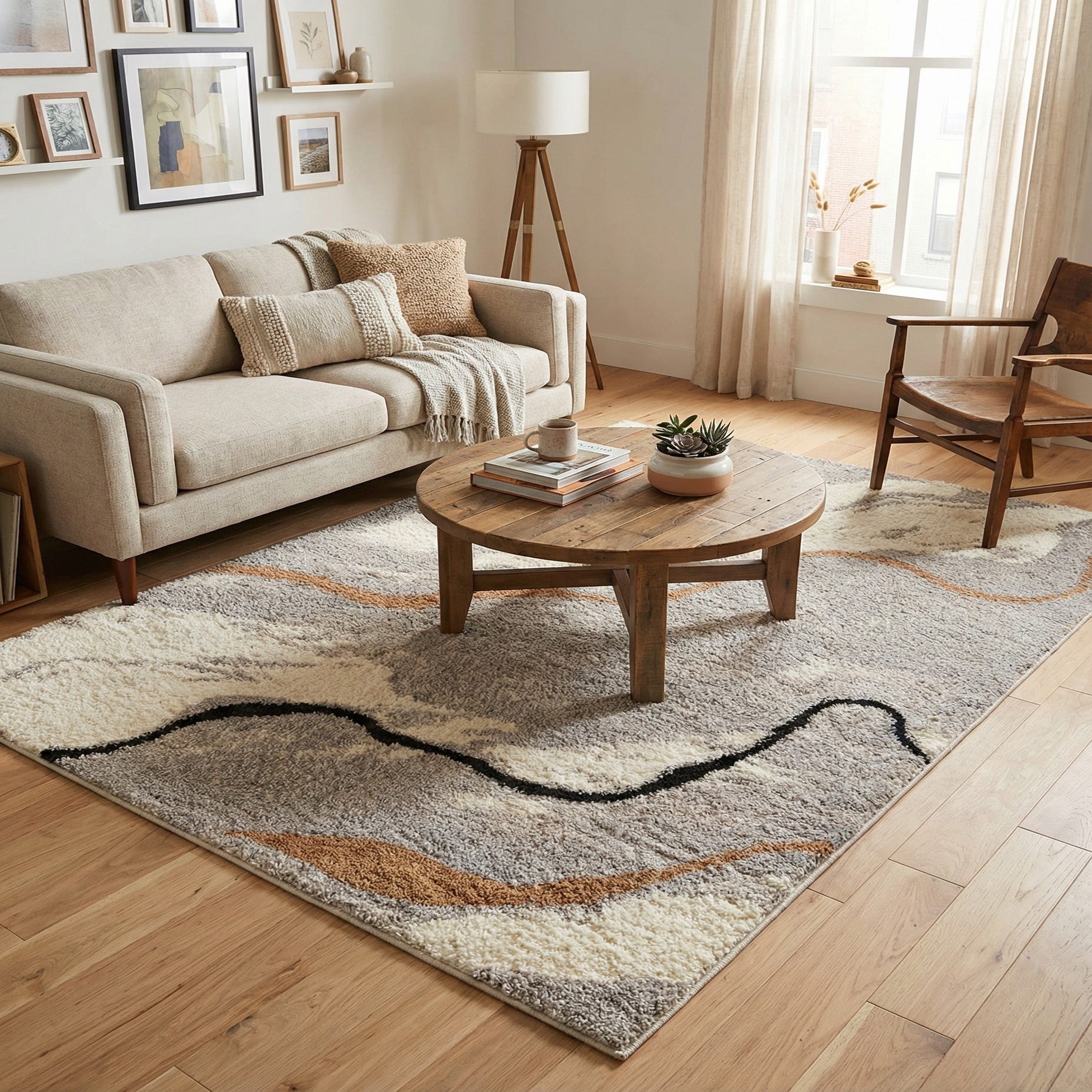 Made of polypropylene and polyester, the pile has a plush, slightly dense hand that cushions footsteps and shows the pattern with clear definition. Place it beneath a low-profile sofa and coffee table in a contemporary living room, layer it at the foot of a bed for added texture in a neutral bedroom, or use it to warm a home office paired with light wood furniture and black metal accents. It complements minimalist, mid-century, and transitional interiors, and pairs especially well with neutral upholstery, warm leather tones, and matte black fixtures.