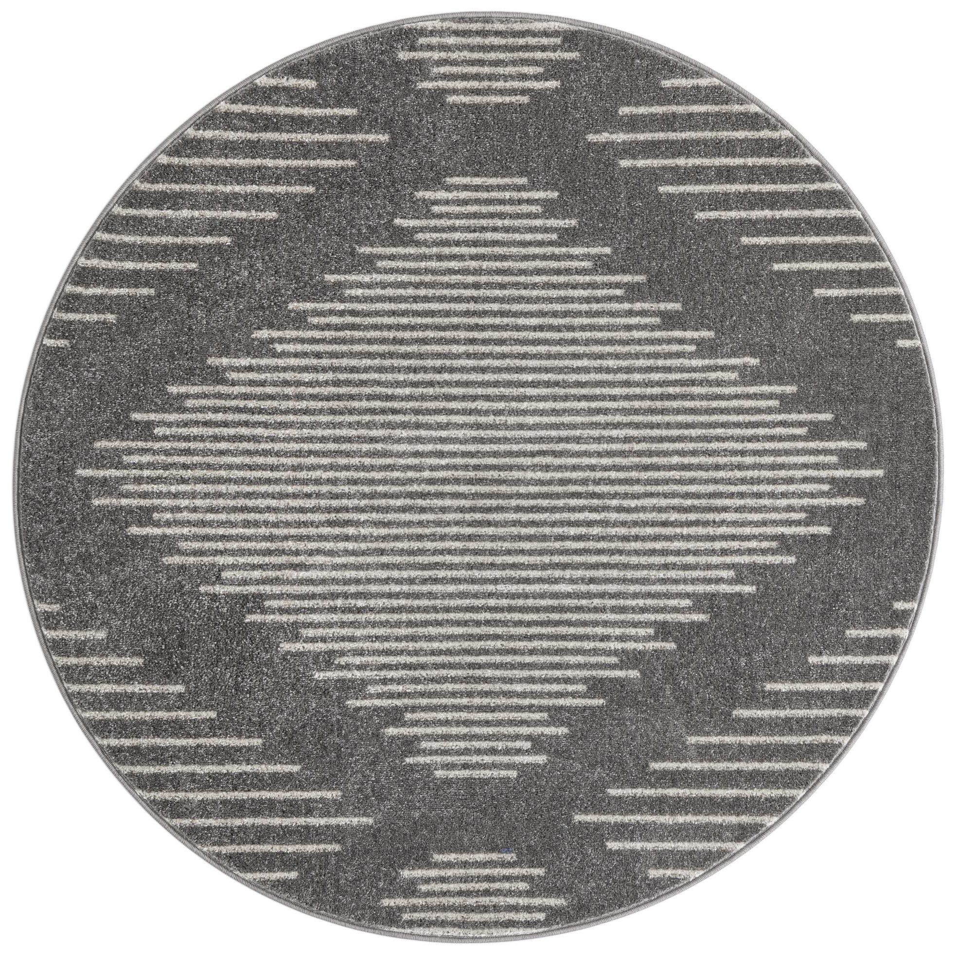 A round 5' 0 x 5' 0 gray and ivory rug with a geometric striped diamond pattern at its center, suitable for a patio.