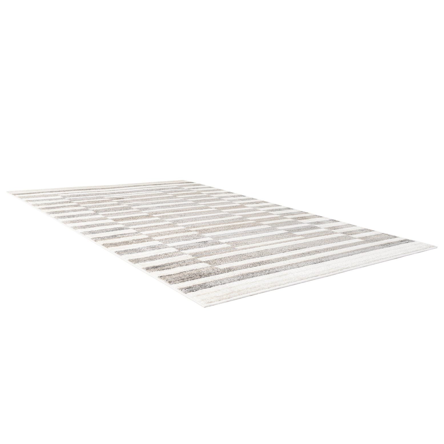A 5x8 rectangular modern area rug featuring a geometric stripe pattern in shades of ivory, cream, and gray.