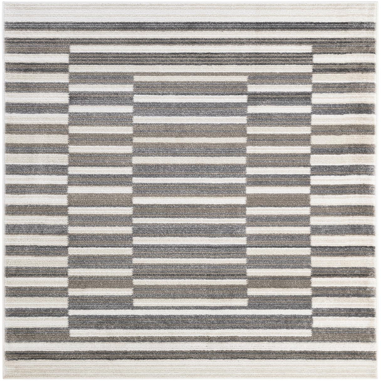 A 5x8 rectangular modern area rug featuring a geometric stripe pattern in shades of ivory, cream, and gray.