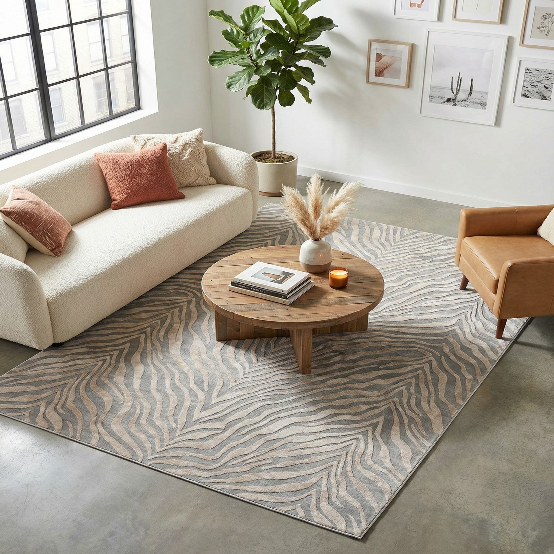 A flowing, zebra-inspired pattern of sinuous stripes moves across a gray and ivory field, creating a sense of motion without overpowering a room. The lines gather toward the center in soft chevrons, producing an organic, contemporary look that complements both minimalist and layered interiors. The neutral two-tone palette keeps the design versatile, letting texture and form be the focal points.