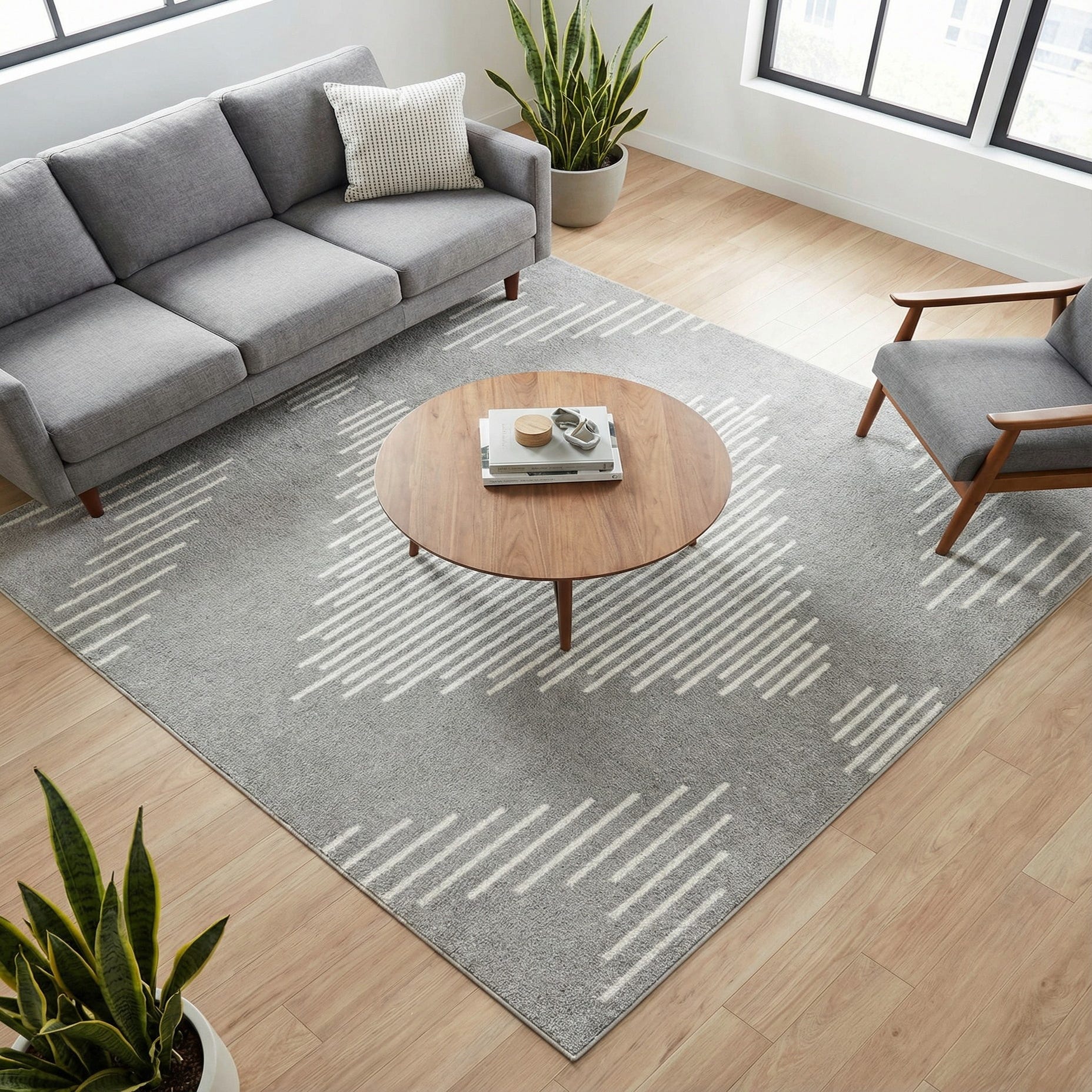 This rug works well as a grounding piece in a contemporary living room beneath a neutral sofa and simple coffee table, or layered in a bedroom with light wood furniture and soft linens. It also complements minimalist, Scandinavian, transitional, or modern farmhouse interiors and makes a composed statement in a home office or entryway where you want a neutral foundation with gentle geometric interest.