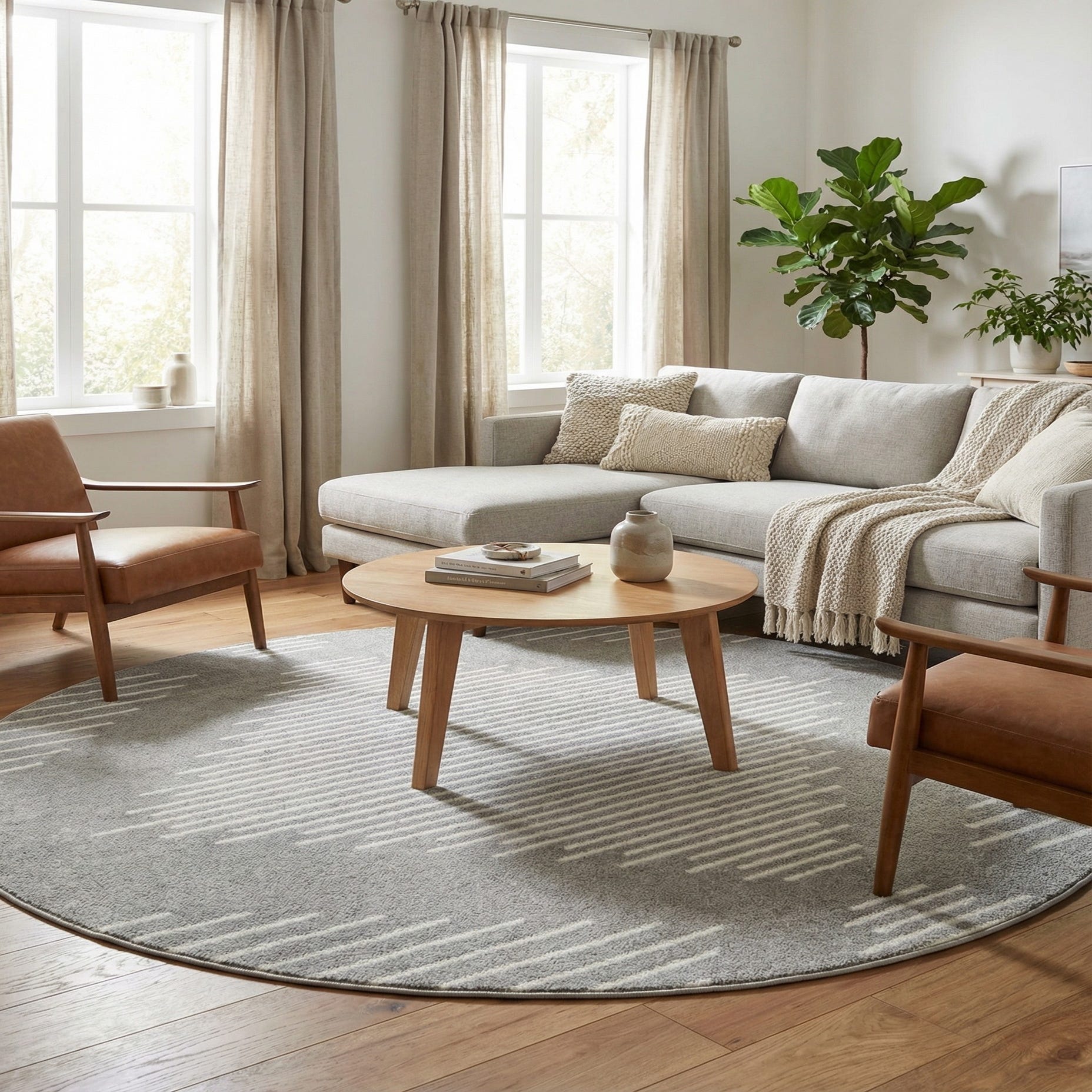 Place this rug beneath a round coffee table to anchor a living area, beneath a small dining set to define a casual eating nook, or in a bedroom or home office to warm hard floors while keeping a streamlined aesthetic. It pairs nicely with light-wash woods, matte black metal accents, and soft neutral textiles, and works equally well layered with textured throws or crisp leather seating for a composed, contemporary space.