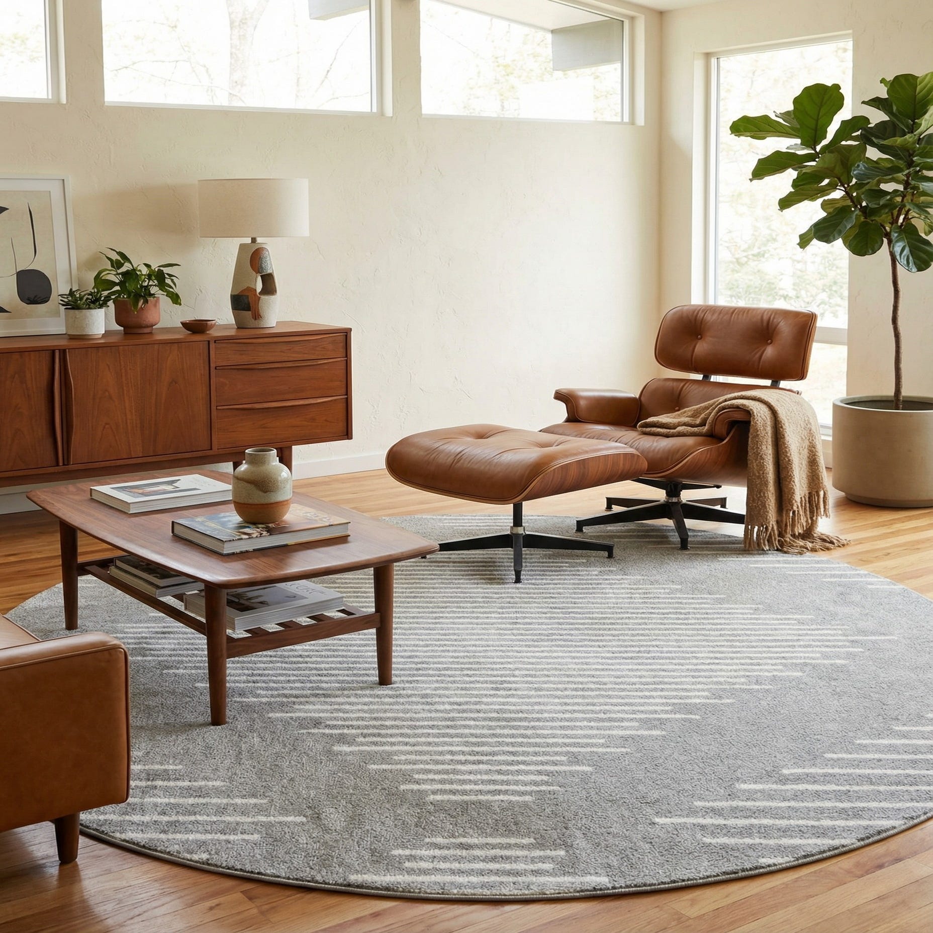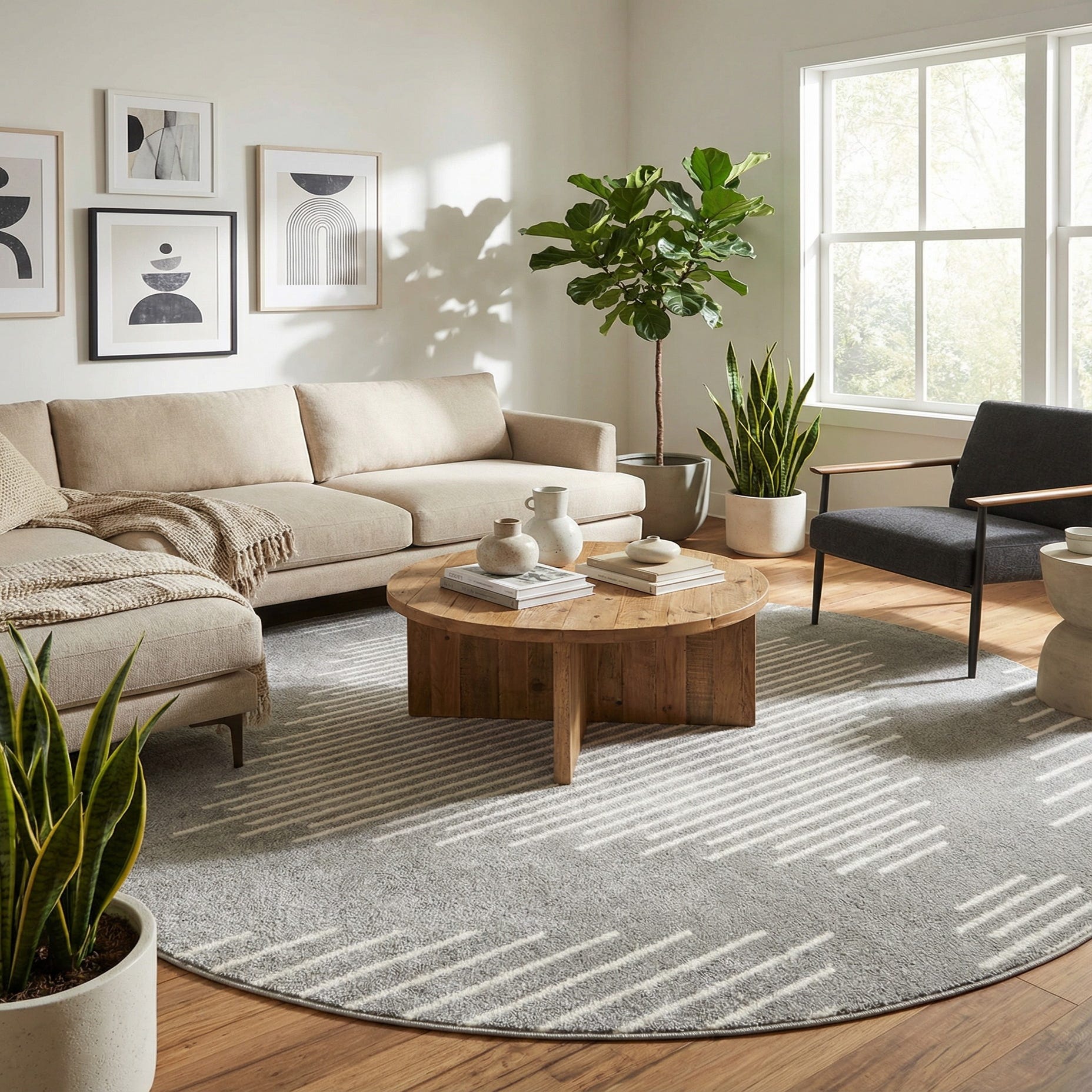 Place this rug beneath a round coffee table to anchor a living area, beneath a small dining set to define a casual eating nook, or in a bedroom or home office to warm hard floors while keeping a streamlined aesthetic. It pairs nicely with light-wash woods, matte black metal accents, and soft neutral textiles, and works equally well layered with textured throws or crisp leather seating for a composed, contemporary space.