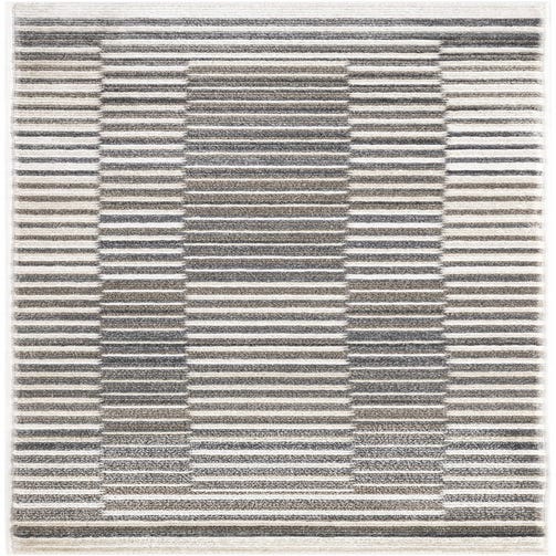 An 8 ft runner rug from the Odyssey collection, featuring a modern stripe pattern in ivories, creams, and grays, ideal for a hallway or kitchen.