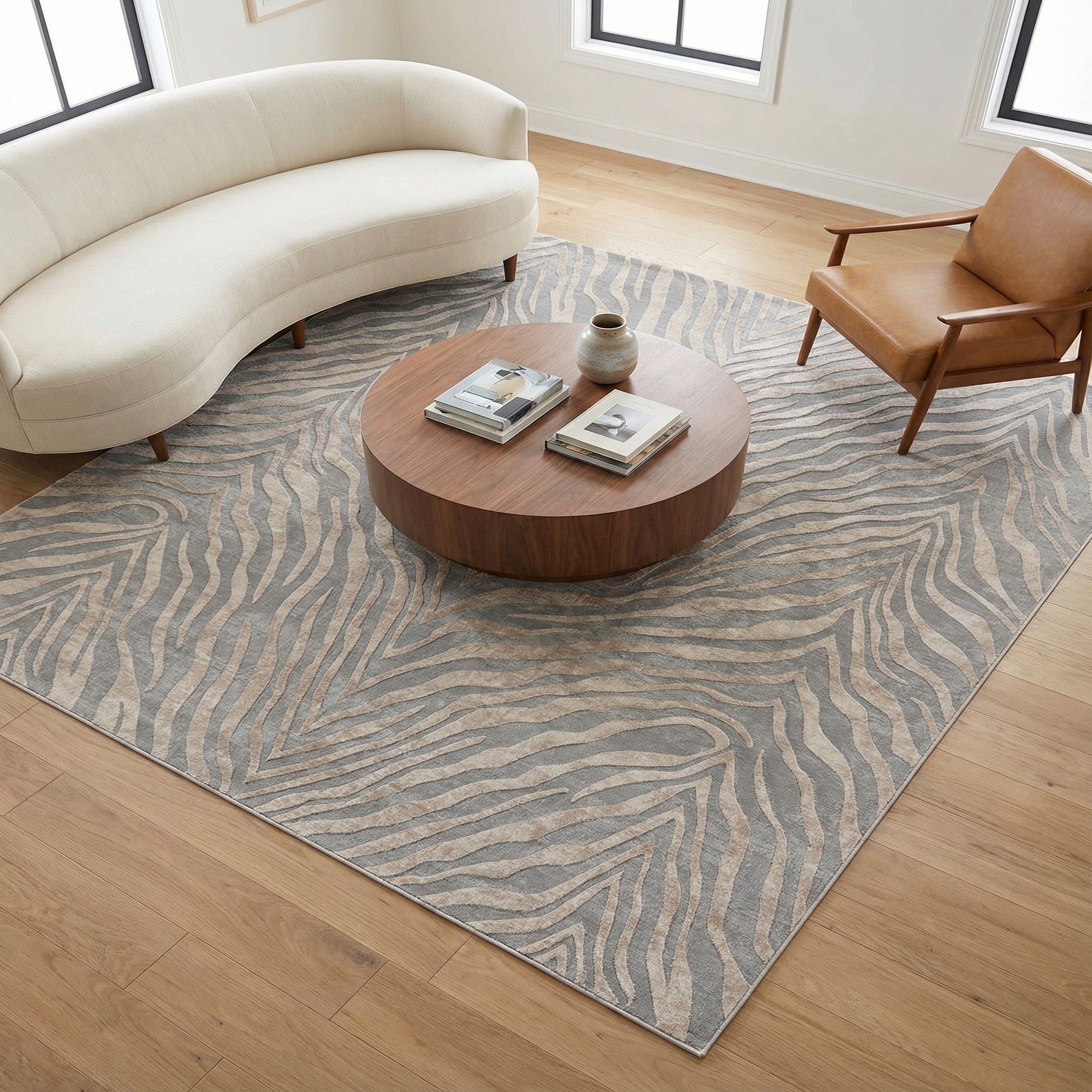A flowing zebra-inspired pattern in gray and ivory gives this rug a calm, organic movement that reads modern without feeling loud. Broad, undulating stripes create a layered look with soft tonal shifts, and the machine-made construction (60% polypropylene, 40% polyester) produces a low, smooth pile with a gentle sheen and a pleasant hand underfoot. The neutral palette and rhythmic pattern add visual interest while keeping the overall effect understated.