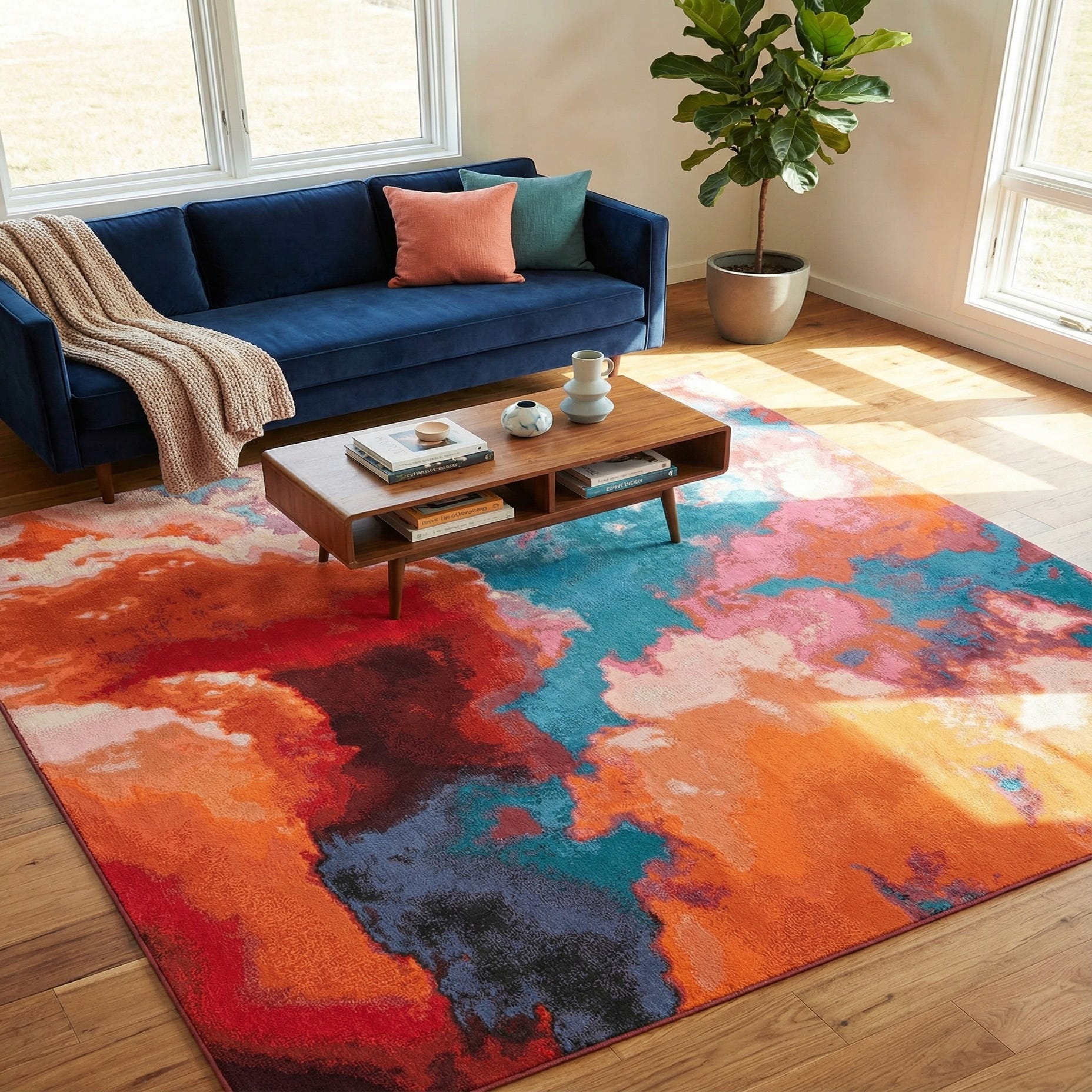 This rug works well on a covered patio, sunroom, or any lively living area where bold color can anchor the room. Pair it with neutral seating to let the palette take center stage, or use it with warm wood furniture and terracotta accents to enhance the orange and red tones. It also complements navy or teal throw pillows and simple metallic accents for a contemporary, layered look.
