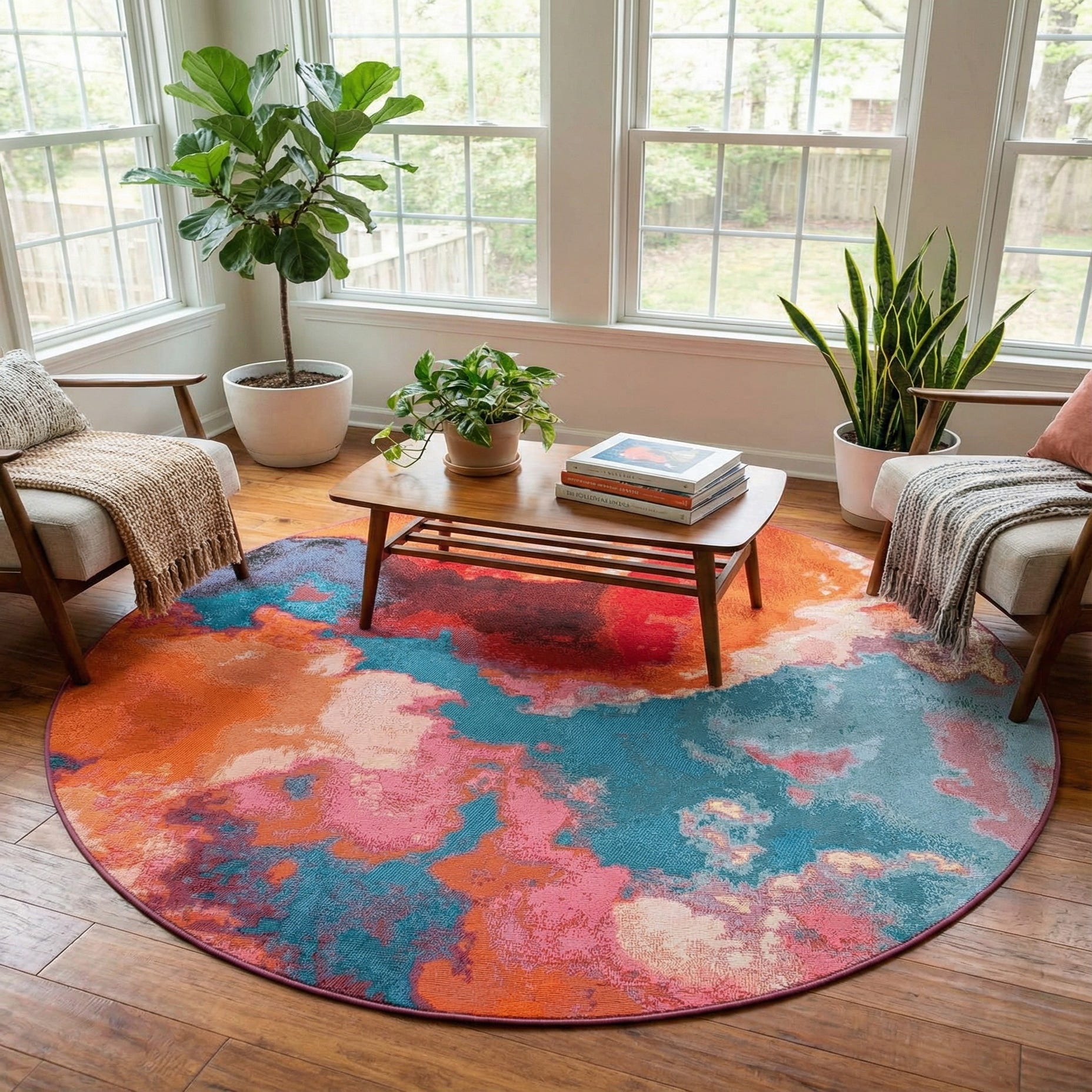 Place this rug where you want a confident splash of color: beneath a circular bistro set on a covered patio, as the focal point of a sunroom, or layered under a round coffee table in a contemporary living area. It pairs well with mid-century modern furnishings and clean-lined outdoor seating, and also complements bohemian accents or neutral upholstery that benefit from a strong color anchor. The low-profile weave keeps furniture stable and makes the pattern work in both indoor and sheltered outdoor settings.