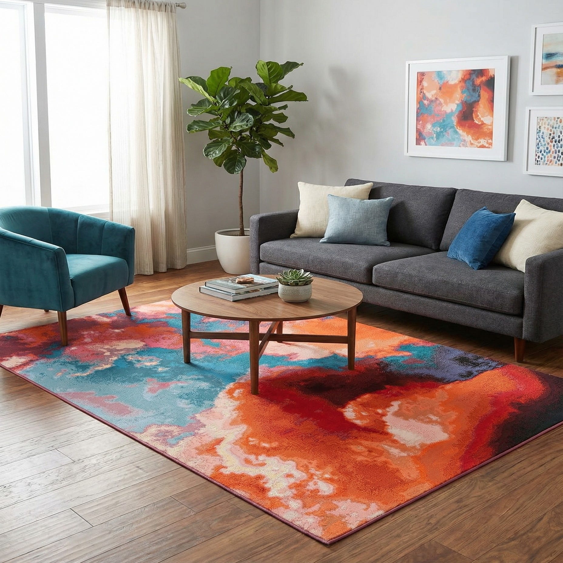 Woven from 100% polypropylene, this rug holds color well and lays flat in high-traffic areas, making it a strong choice for covered patios, sunrooms, or a living room that needs a bold focal point. Pair it with mid-century wood furnishings and warm metal accents to emphasize the orange and red tones, or use neutral seating and woven textures like rattan to balance the brighter blues and pinks. It also complements eclectic layered spaces where artful pattern and color are the anchor.