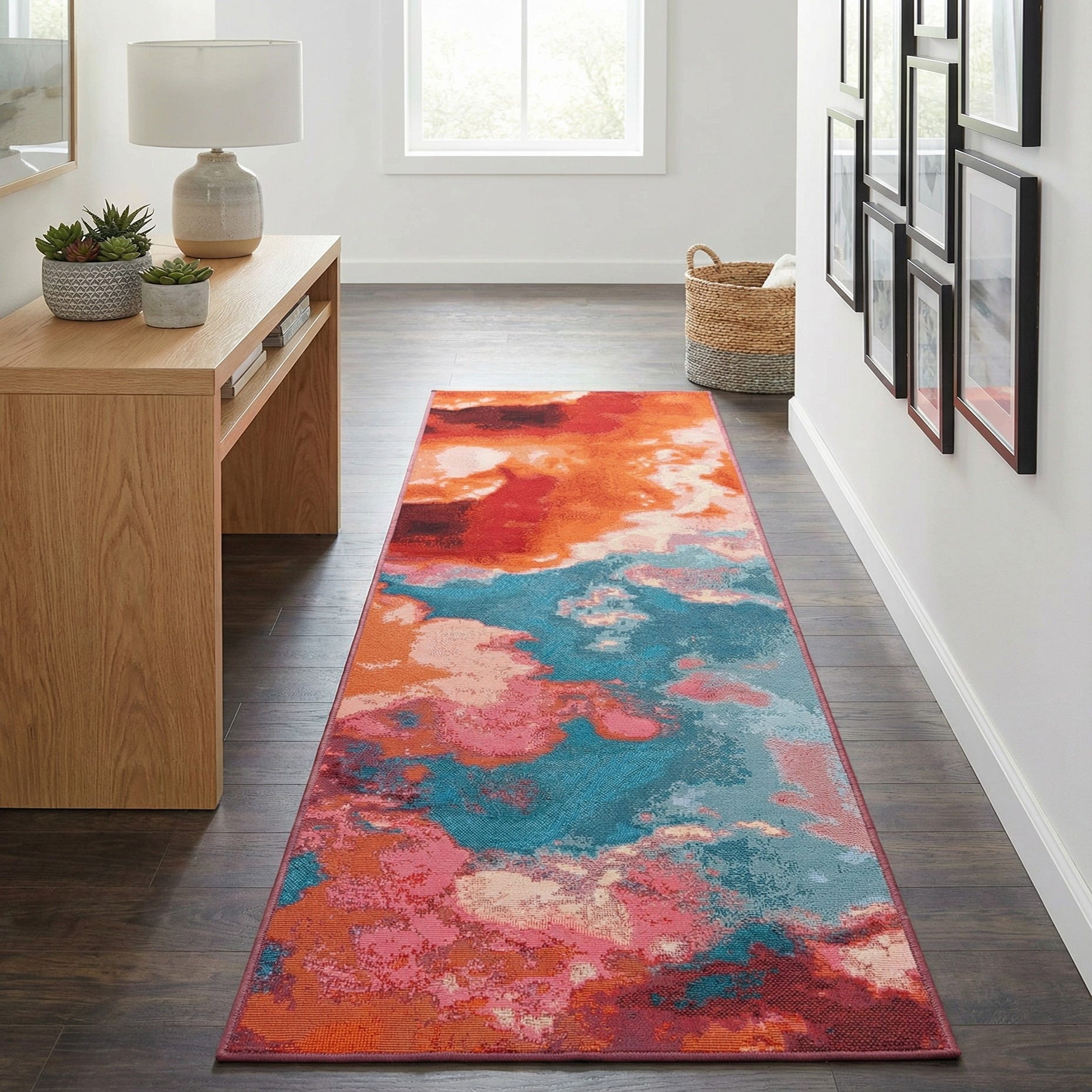 A modern abstract runner rug in a vibrant mix of pinks, oranges, and blues, resembling a colorful cloudy sky.