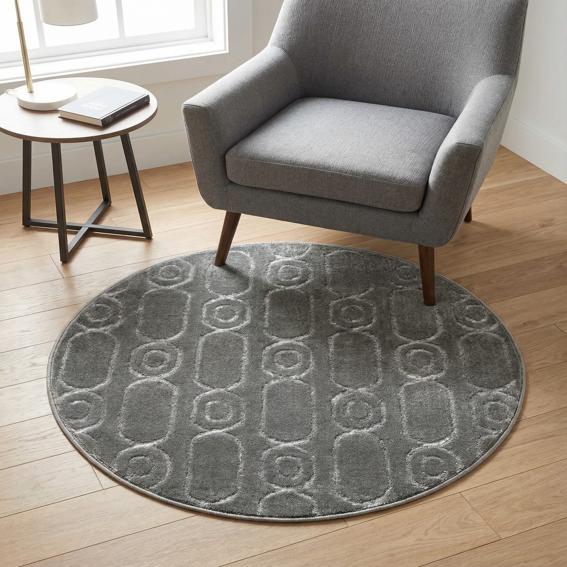 A 3' 0 x 3' 0 round gray and silver rug with an embossed geometric pattern, suitable for a patio.