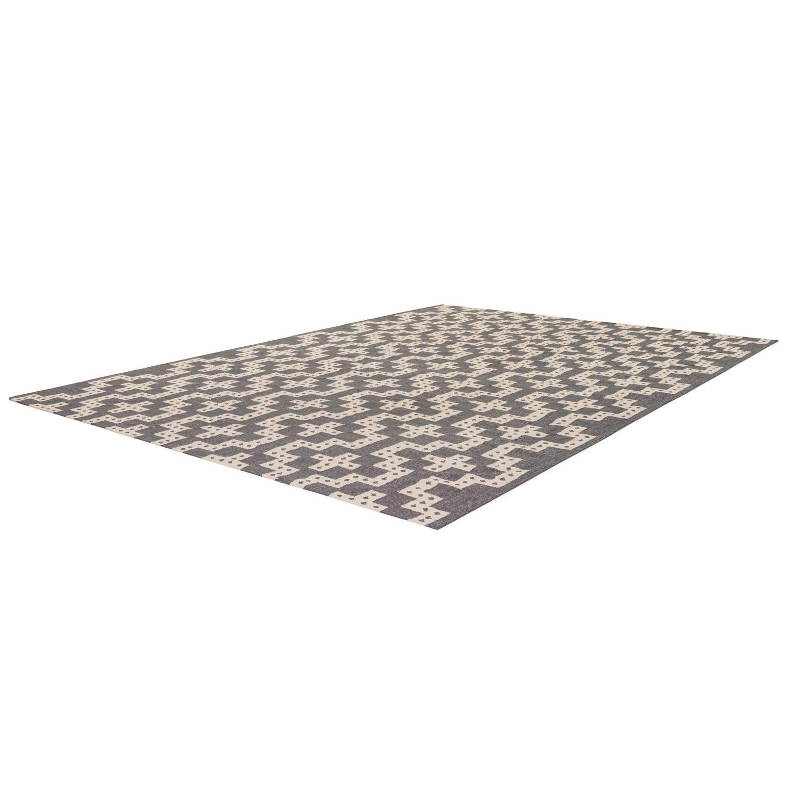 A 10x14 rectangular gray and white tribal wool rug with an interlocking geometric pattern, suitable for a living room.