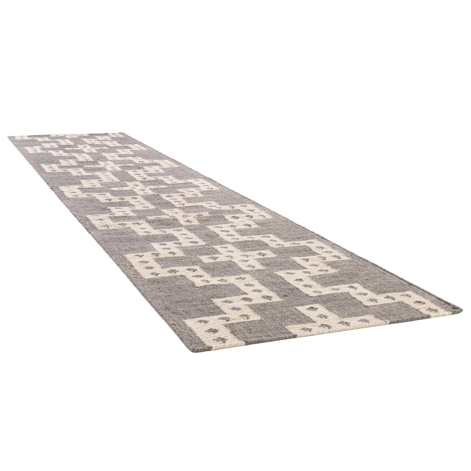 A 12 ft runner rug with a tribal geometric pattern in gray and white, suitable for a hallway.