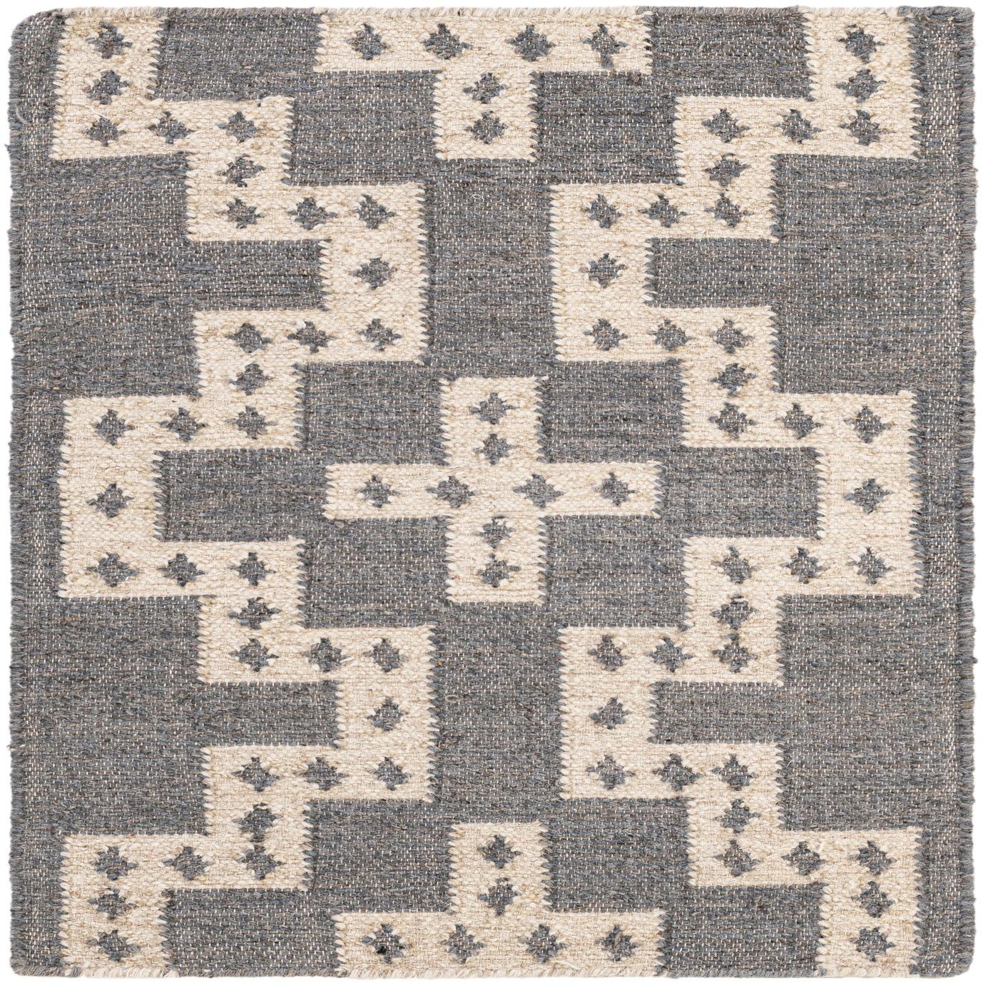 A 2x3 rectangular gray and white tribal wool rug with a repeating geometric pattern, suitable for an entryway.