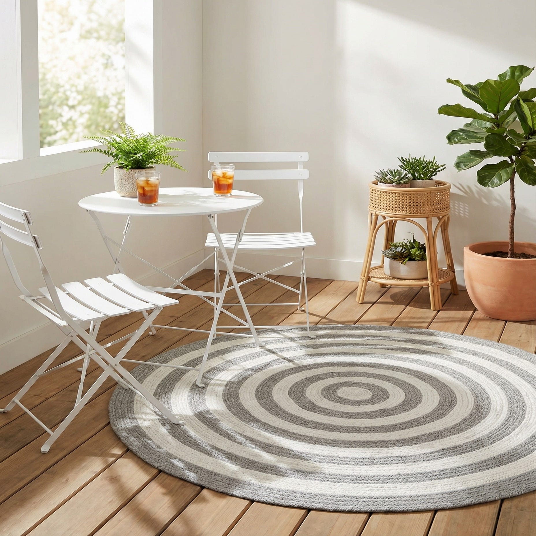 This round shape and neutral colorway work well in a number of settings: set under a small bistro table on a covered porch, place in an entry to define a circular landing, or layer beneath a round coffee table to anchor a compact seating area. The gray-and-white stripes pair easily with light woods, slipcovered sofas, and minimalist metal accents for coastal, Scandinavian, or casual contemporary interiors.