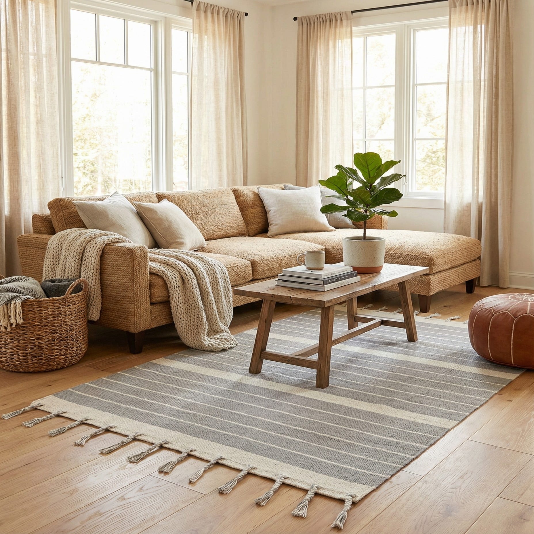 Moreover, the stain-resistant nature of the rug makes it practical for high-traffic areas or spaces prone to spills. Its simplicity in design and color lends itself to a variety of decor settings—from industrial and modern lofts to more relaxed coastal or Scandinavian-inspired interiors. It can serve as a grounding element in a minimalist space or complement the layered textures of a bohemian-styled room.