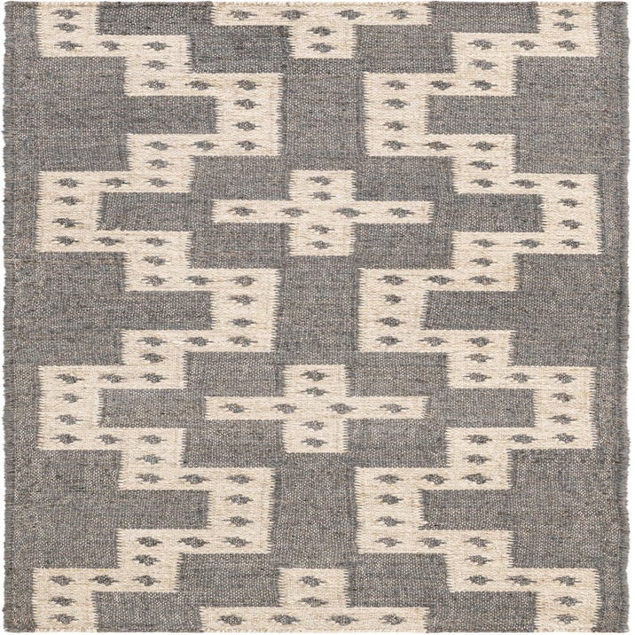 A 6 ft runner rug with a gray background and an interlocking white tribal geometric pattern, featuring small gray accents within the white shapes.