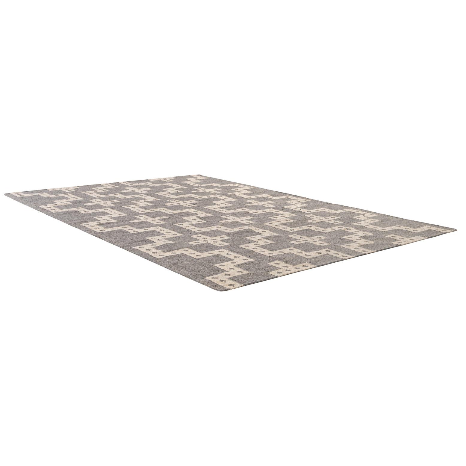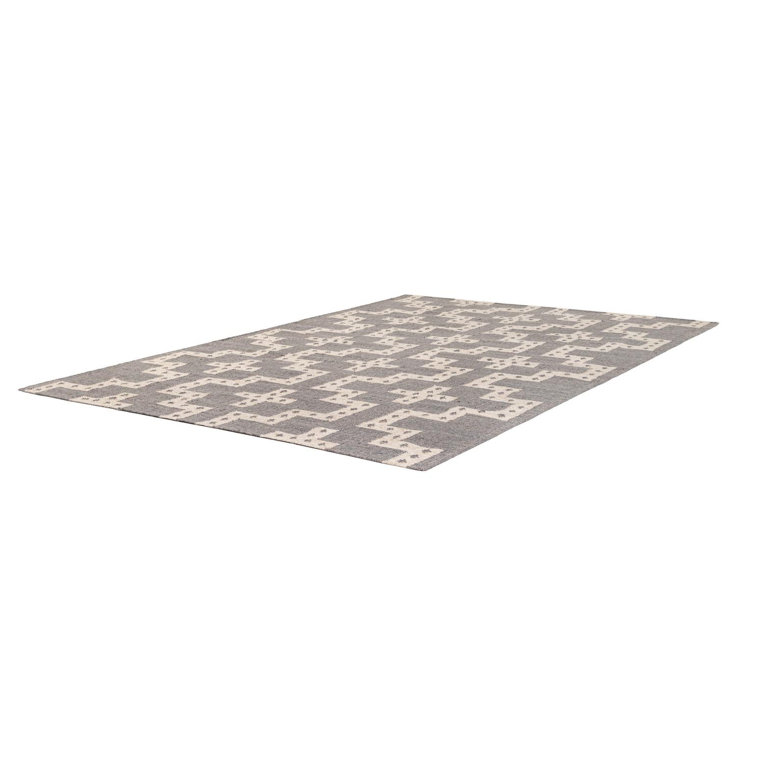 A 6x9 rectangular gray and white tribal flatweave wool rug with a modern geometric pattern, suitable for a living room.