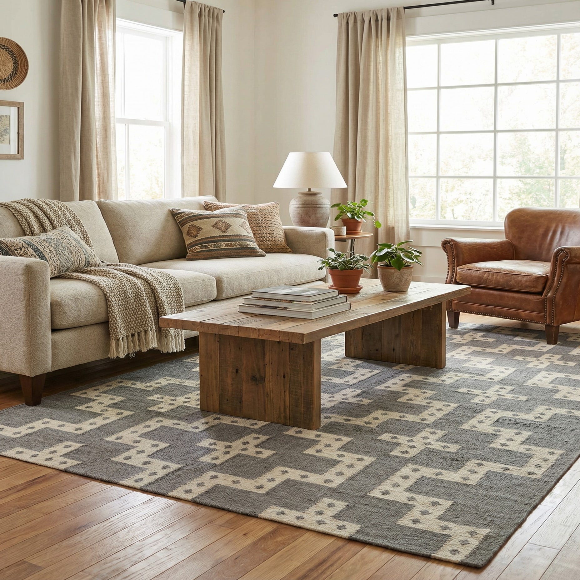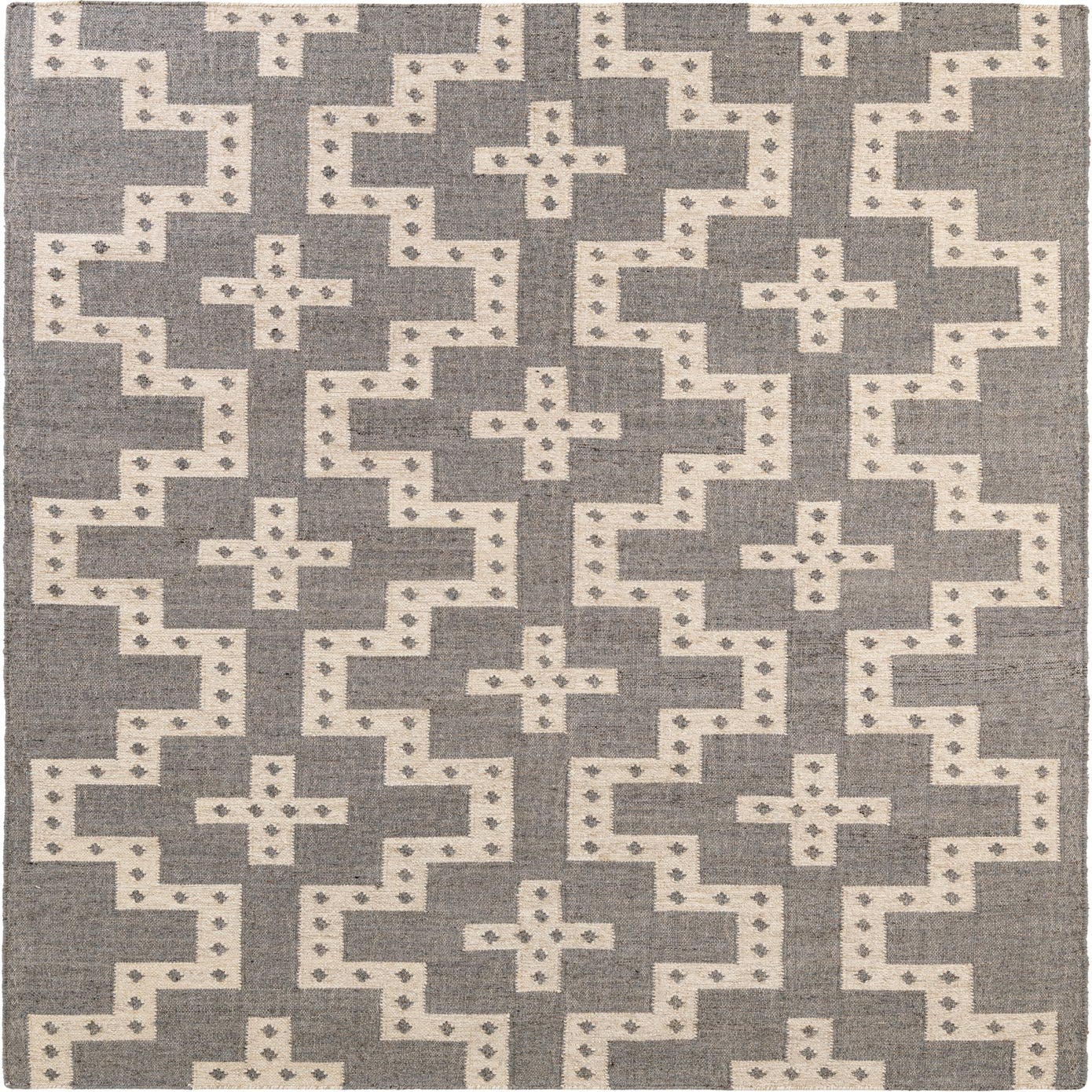 A 6x9 rectangular gray and white tribal flatweave wool rug with a modern geometric pattern, suitable for a living room.