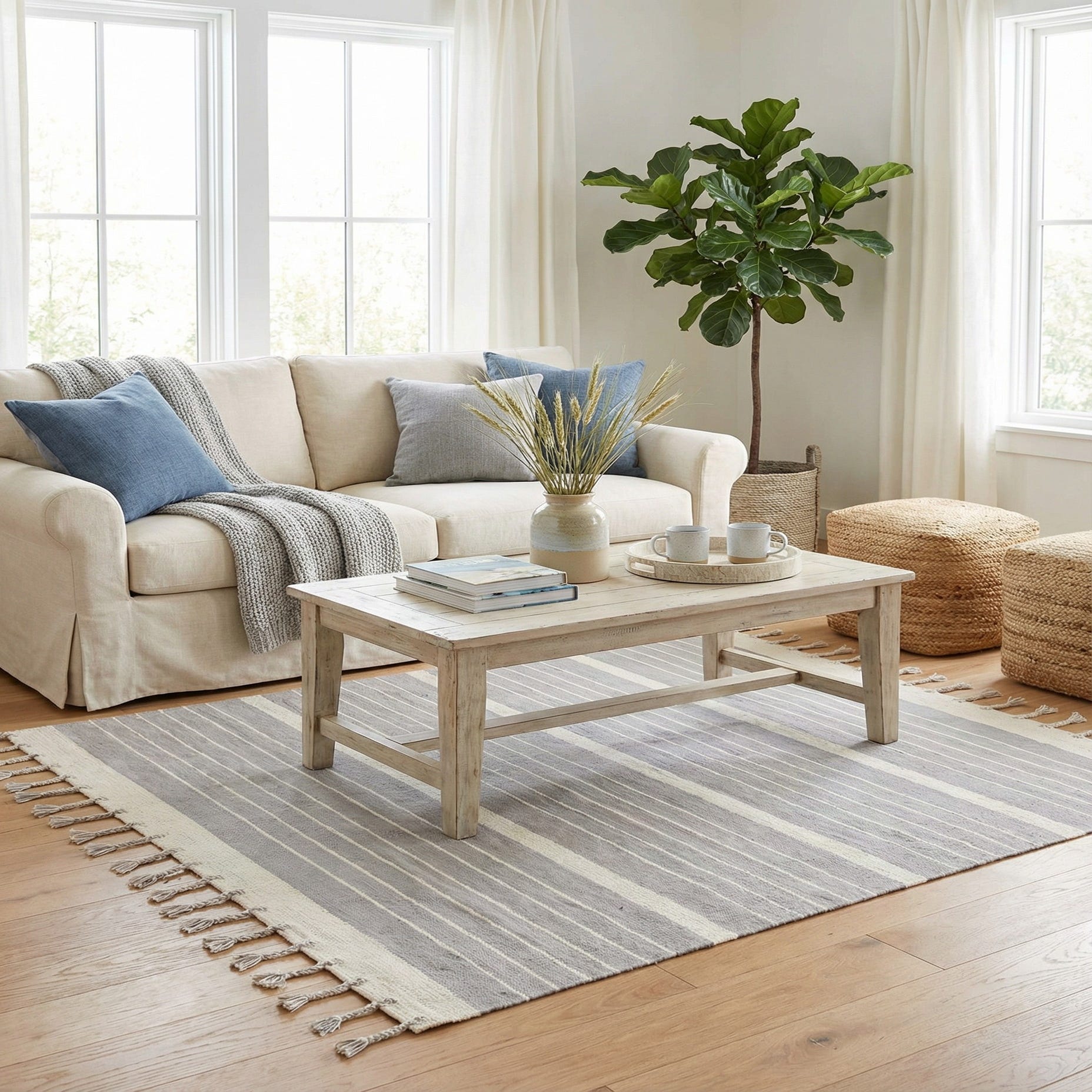 This piece works well to anchor a relaxed seating area, sit beneath a small dining set, or add layering texture at the foot of a bed. It pairs naturally with light woods, linen upholstery, woven baskets and muted color palettes—suited to coastal, Scandinavian, modern farmhouse, or casual transitional interiors where clean lines and soft neutrals are preferred.