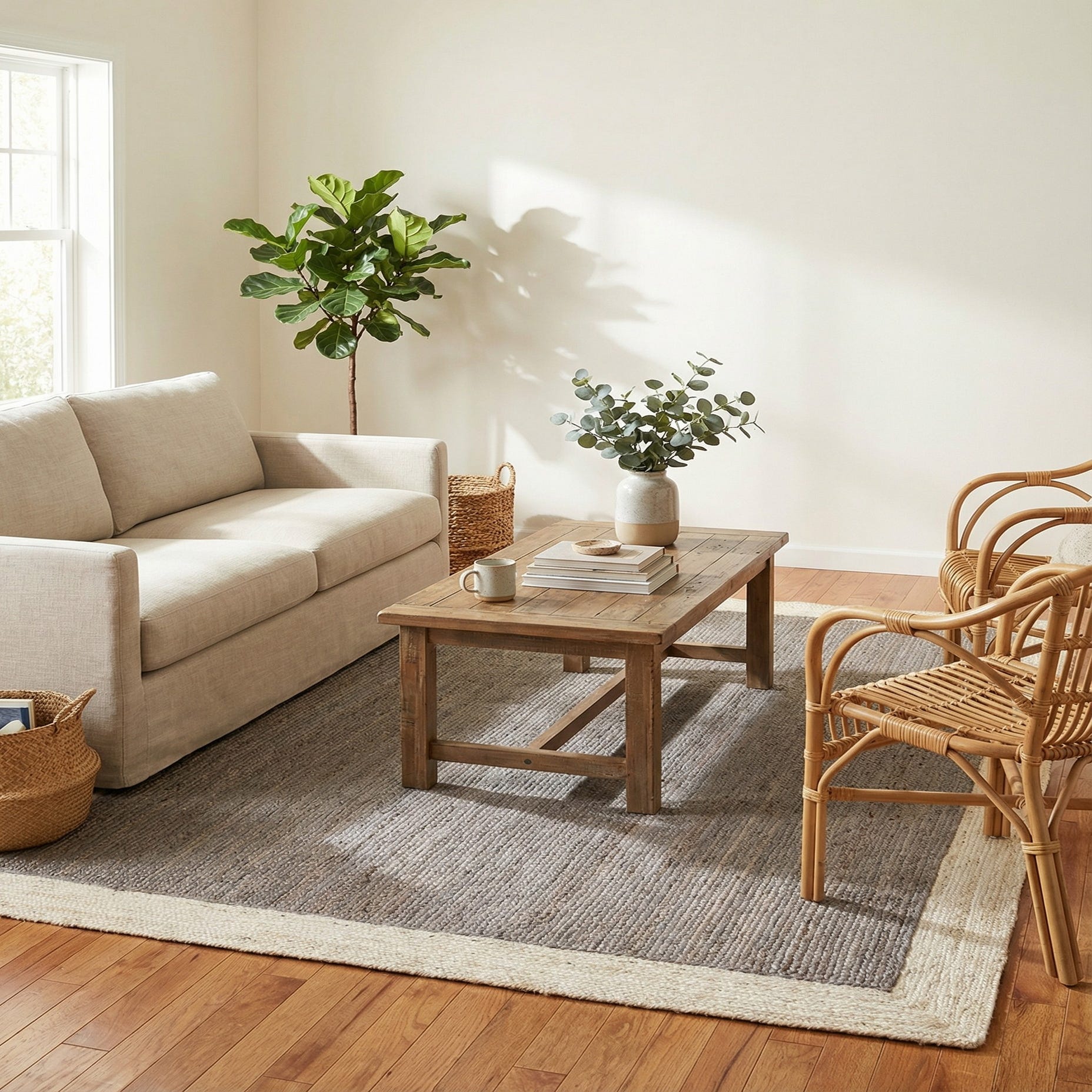 An 8x10 rectangular gray jute area rug with a wide natural white braided border, showcasing its textured, flatweave design.