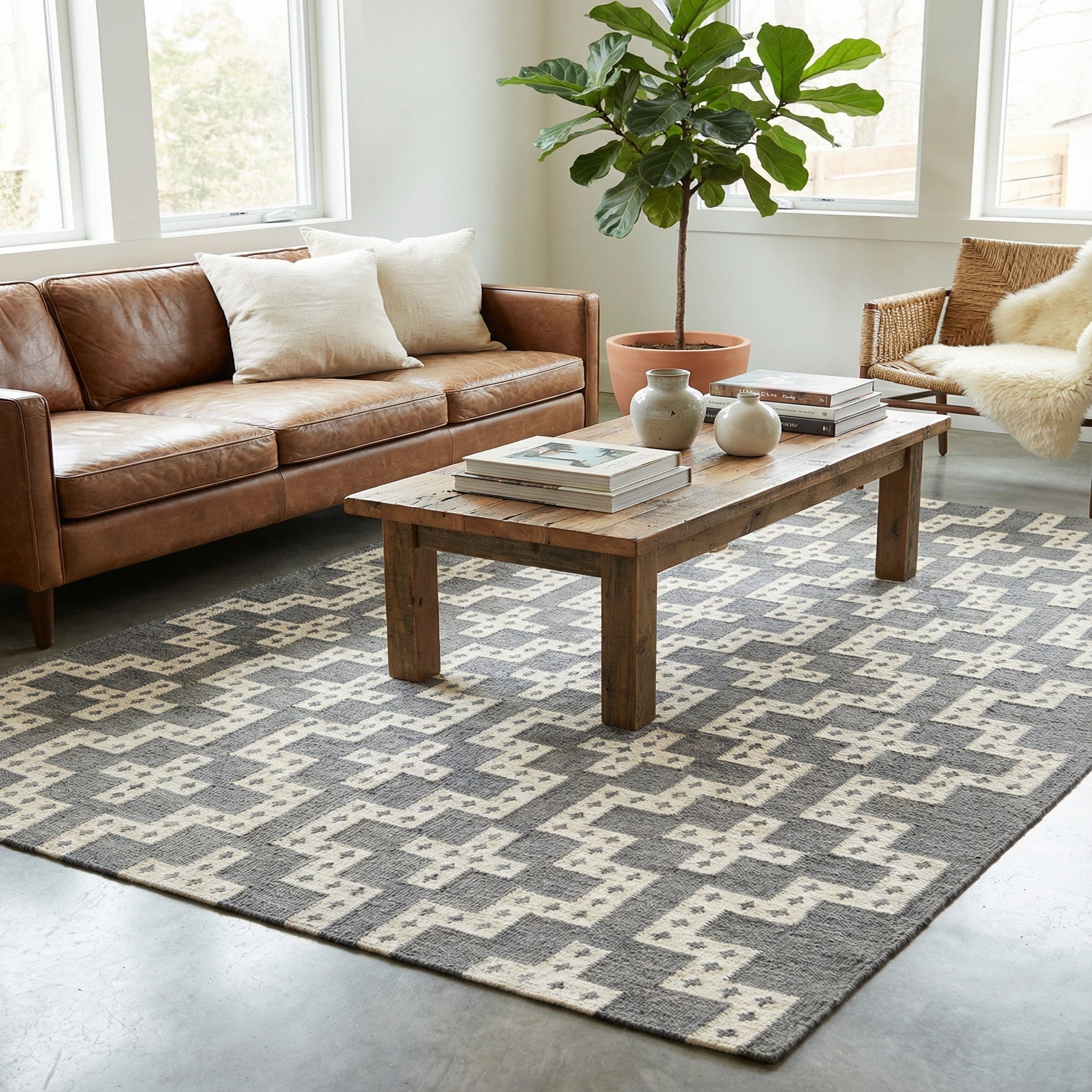 This rug pairs easily with warm wood tones, leather seating, or streamlined metal furniture, and works well in a living room to anchor seating, under a dining table, or layered at the foot of a bed. Its graphic simplicity complements Scandinavian, transitional, or modern farmhouse interiors and provides a neutral foundation for both solid and patterned textiles.