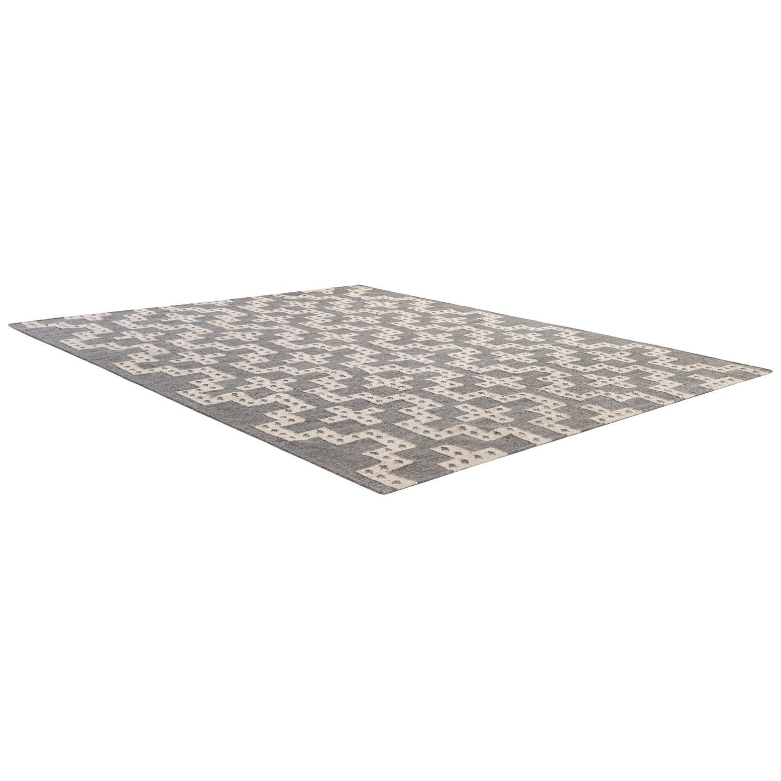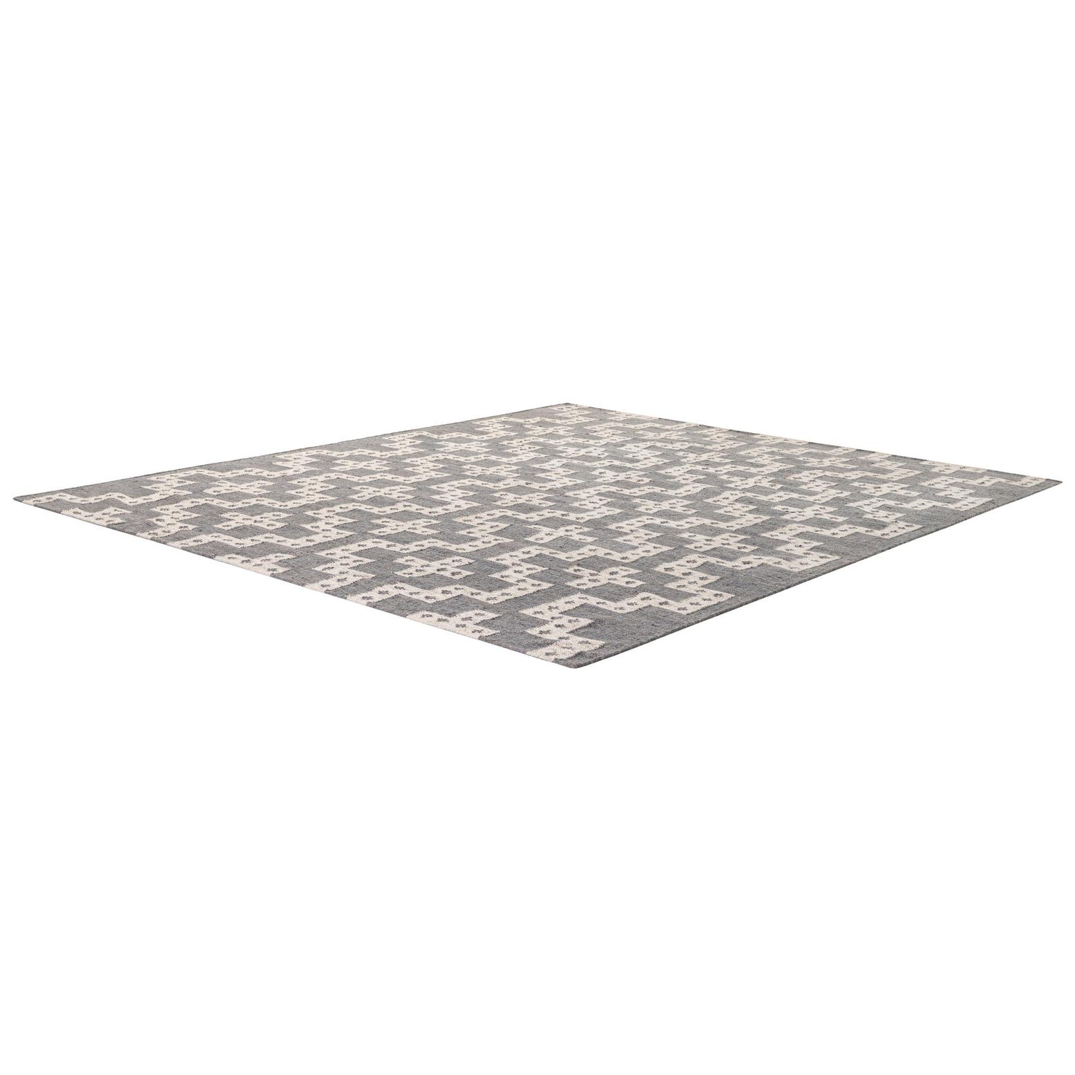 A bold geometric pattern of stepped crosses and nested forms sits across a heathered gray field, rendered in crisp white with tiny dotted accents that add subtle visual texture. Hand woven from 100% wool, the surface has a firm, flat-woven feel that’s pleasant underfoot and shows the clean edges of each motif. The overall look is modern yet grounded, with the gray and white palette keeping the pattern fresh and adaptable.