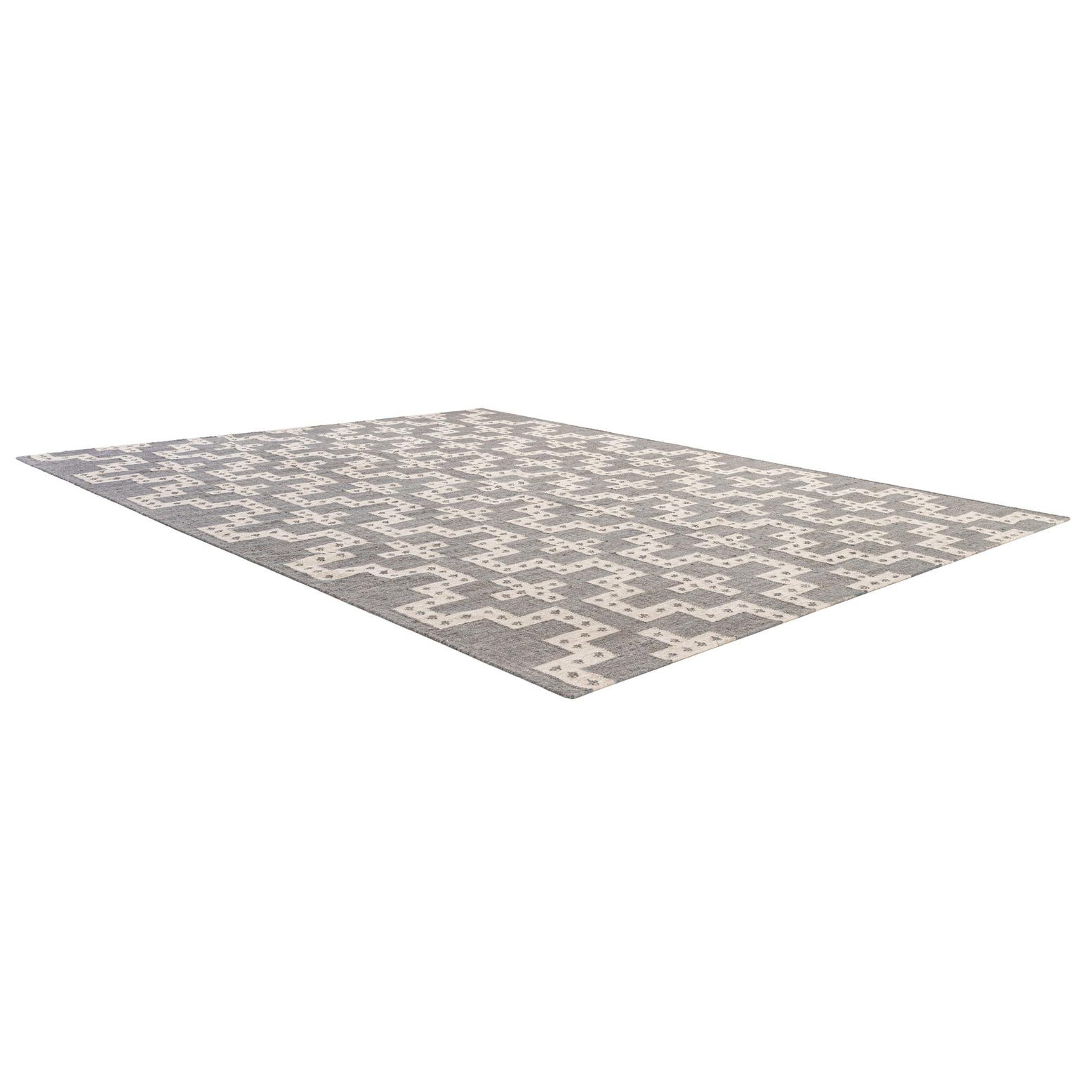 A 9x12 rectangular gray and white wool rug with a repeating tribal geometric pattern, suitable for a living room.