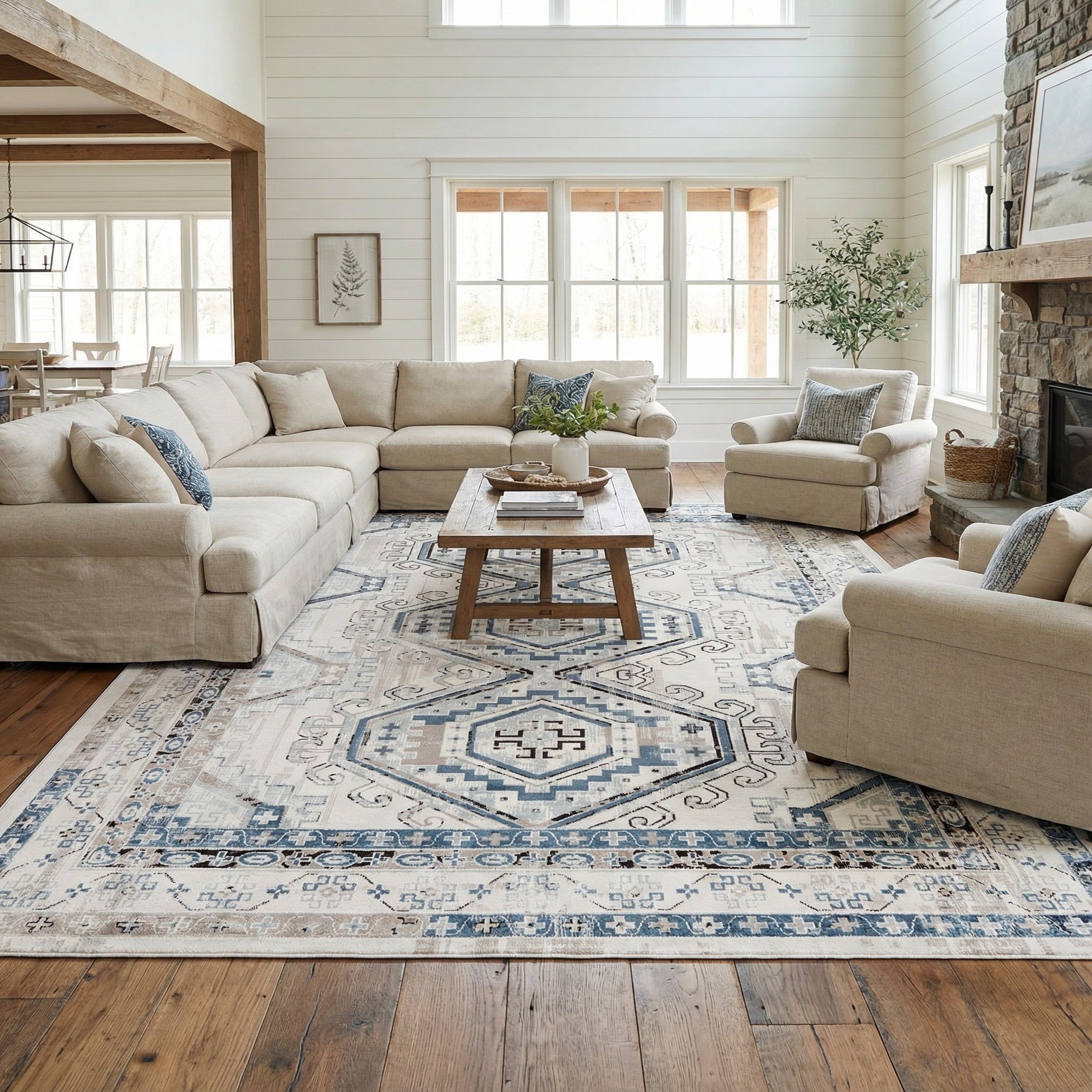 This rug works well as an anchor for a relaxed living room seating group, under a dining table to add pattern without heavy contrast, or layered in a casual bedroom with light wood furniture and neutral linens. It pairs especially well with coastal-inspired palettes, modern farmhouse interiors, or transitional spaces that mix clean lines with organic materials.