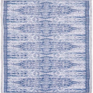 A 13 ft runner rug with a distressed blue and gray traditional medallion pattern, ideal for a hallway.