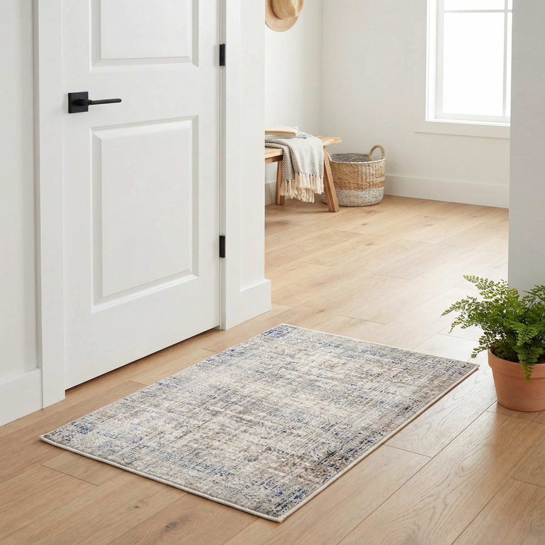 This rug suits a range of interiors—from coastal and contemporary to transitional or modern farmhouse—where a muted, textural foundation is needed. Place it to anchor a small seating group, soften an entryway, or add a calm layer beside the bed or under a desk; it pairs well with light-wood furniture, navy or neutral upholstery, and mixed-metal accents.