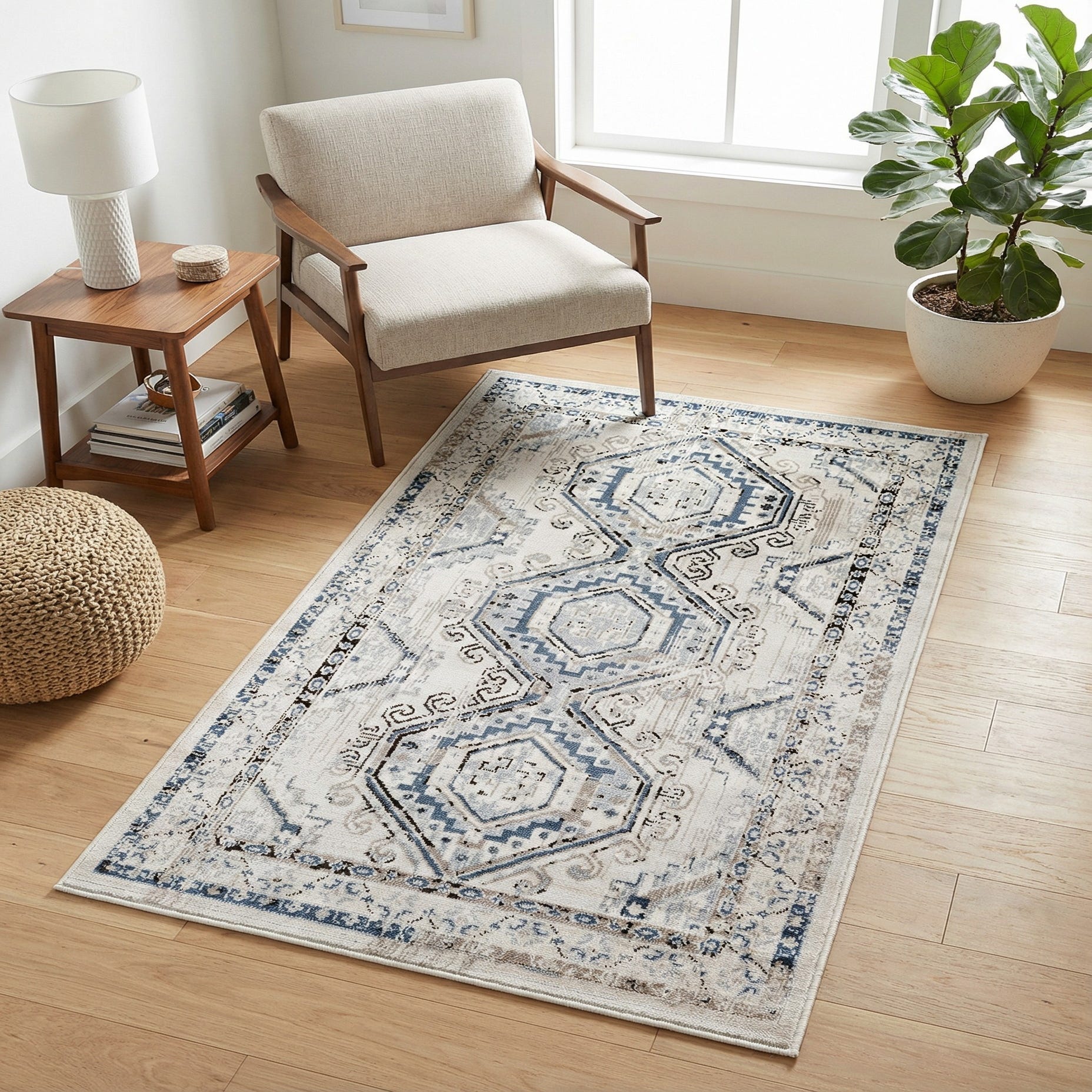 A softly faded medallion design gives this rug a relaxed, collected look. Three linked hexagonal motifs run down the center, framed by a narrow scroll-and-dot border and subtle geometric accents. The background is Gray Blue, with ivory and light blue highlights and warm brown accents that add depth and definition. Machine-made from 100% polypropylene, the rug has a low, slightly dense pile that feels smooth and cushioned underfoot while keeping the pattern crisp and refined.