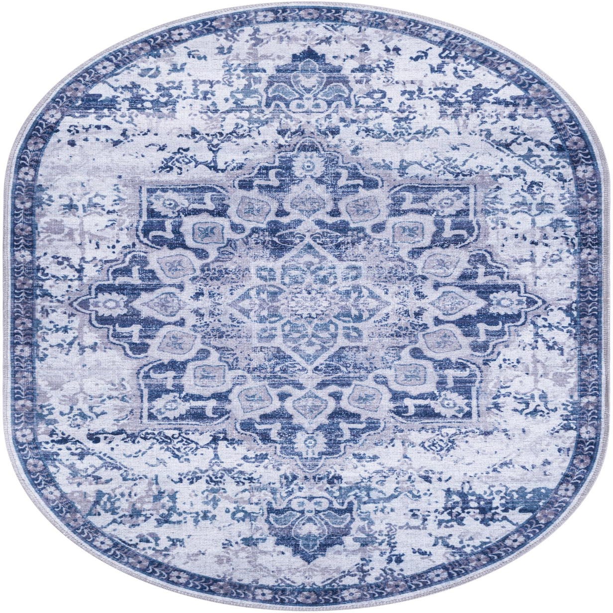 An oval 3' 3 x 5' 3 Francesca rug featuring a distressed blue and gray traditional medallion pattern.