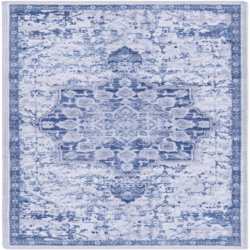 A 4 ft runner rug in blues and grays featuring a distressed traditional medallion pattern, ideal for a hallway.