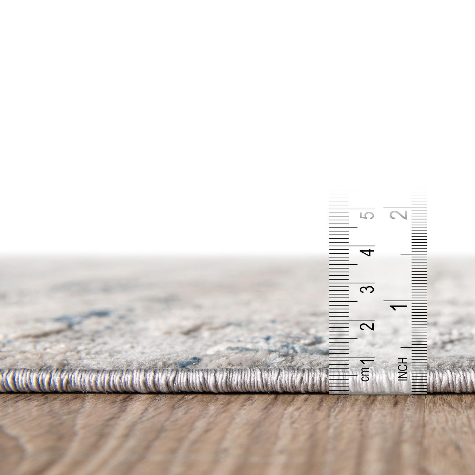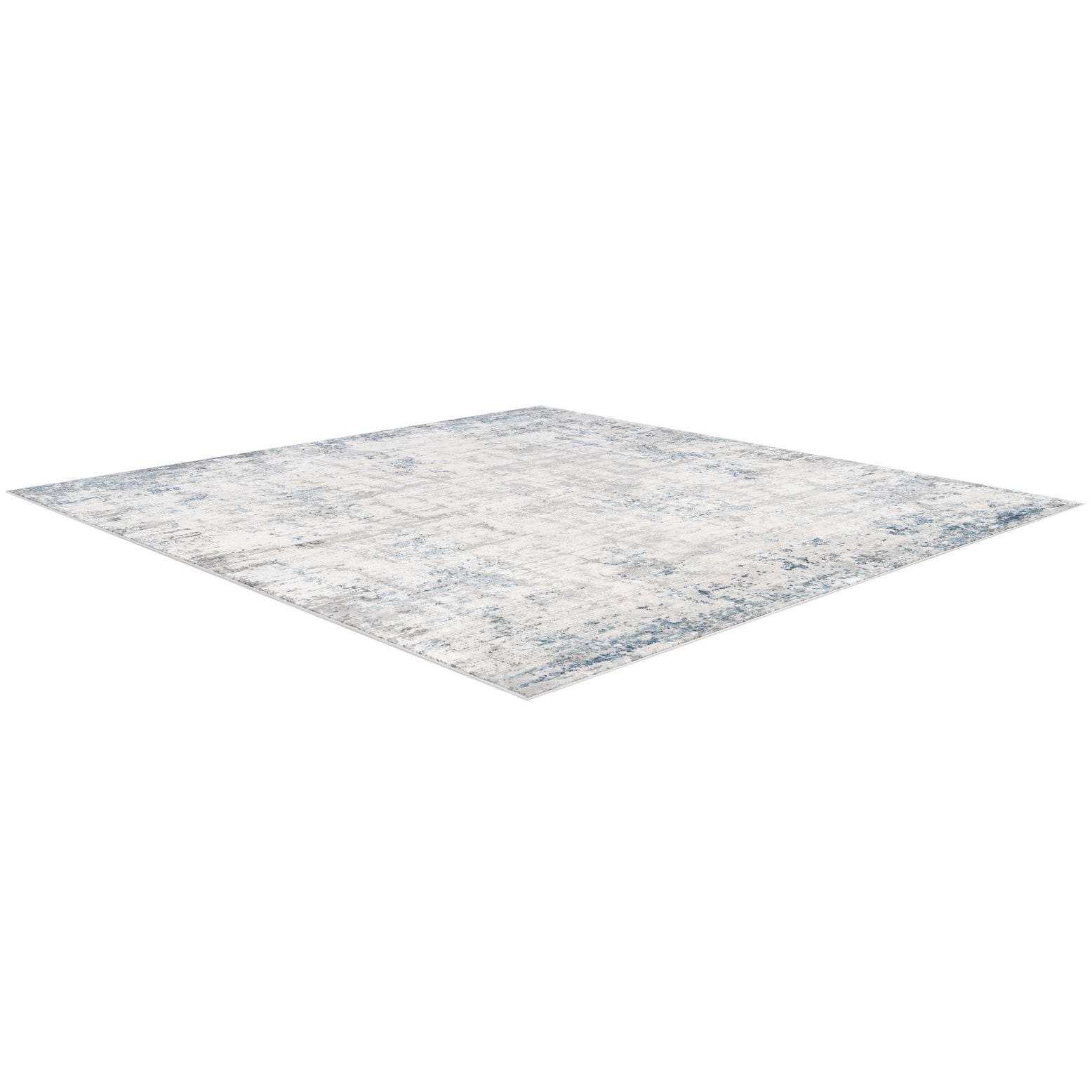 A 6'x6' square modern abstract rug featuring a distressed pattern in shades of blue, gray, and silver.