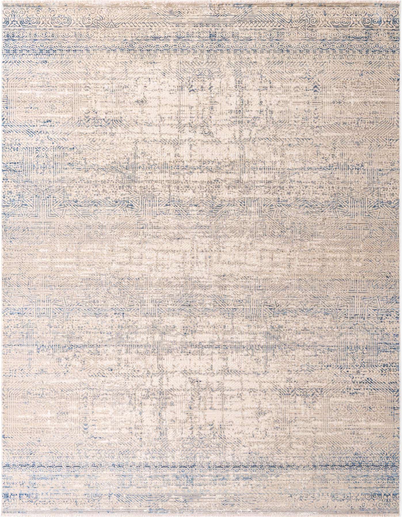 The Deepa Collection offers a 6x9 machine-woven rug crafted from 100% polyester, ensuring durability and a soft texture underfoot. This rug showcases a subtle Gray Blue background, complemented by Ivory accents which create a serene and versatile appearance. The design features a gently distressed look that subtly integrates traditional motifs into its presentation, giving it a timeless quality.