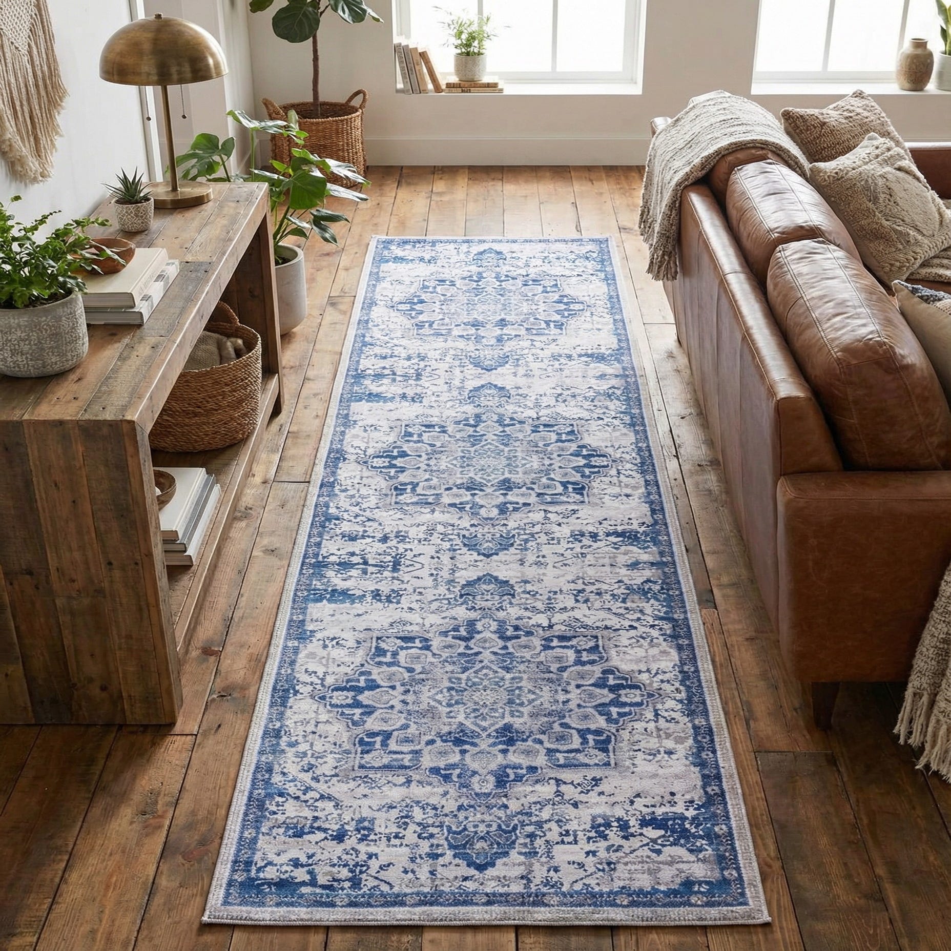 This runner works well in transitional, coastal, or modern farmhouse interiors — ideal for hallways, entryways, or alongside kitchen islands where you want color and pattern without overpowering the space. Pair it with light wood floors, navy or gray upholstery, and natural textiles to enhance the layered blues and ivories, or use it to soften a minimalist setting with a touch of pattern and warmth.