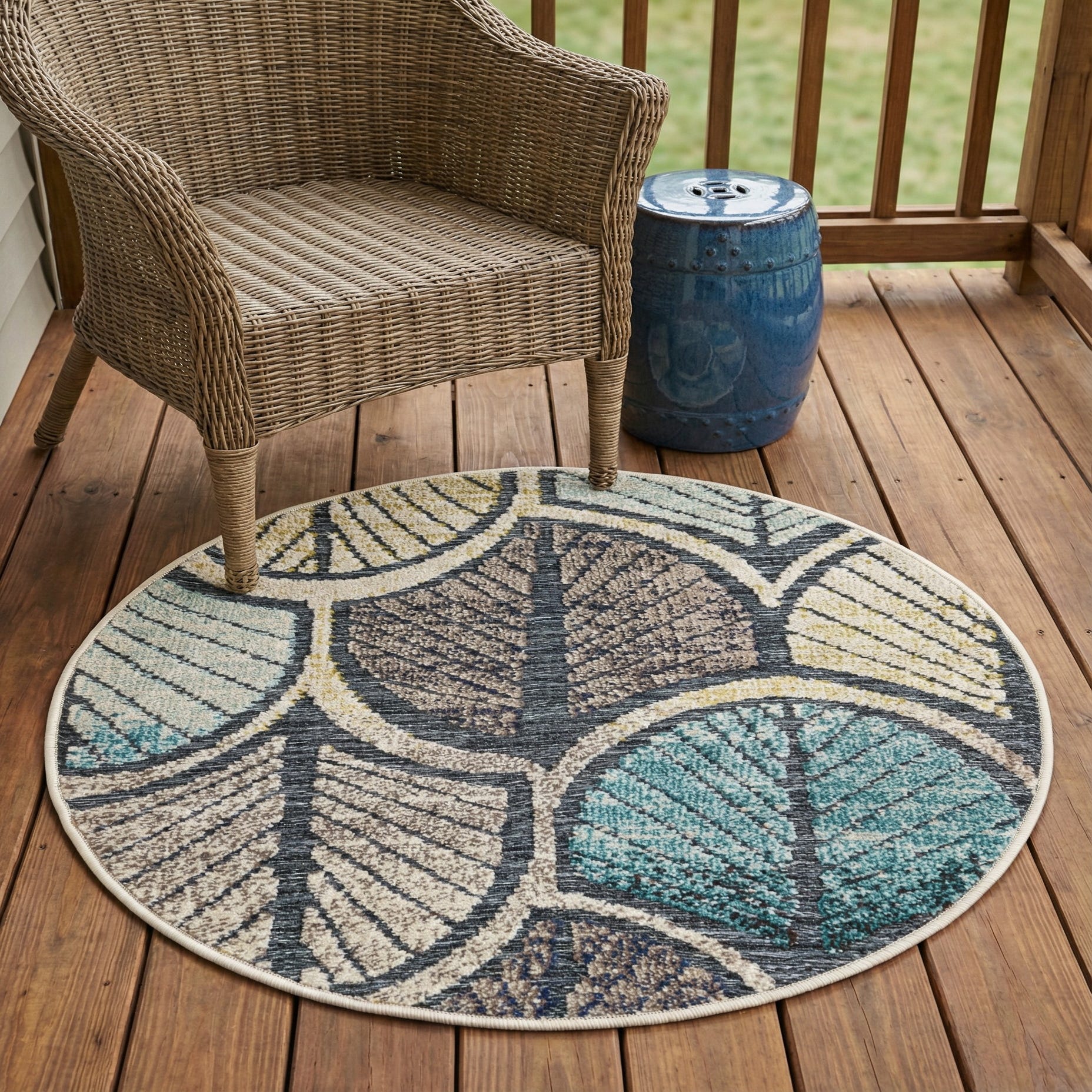 A round gray, blue, and ivory rug with a modern leaf-like pattern, suitable for indoor or outdoor use.