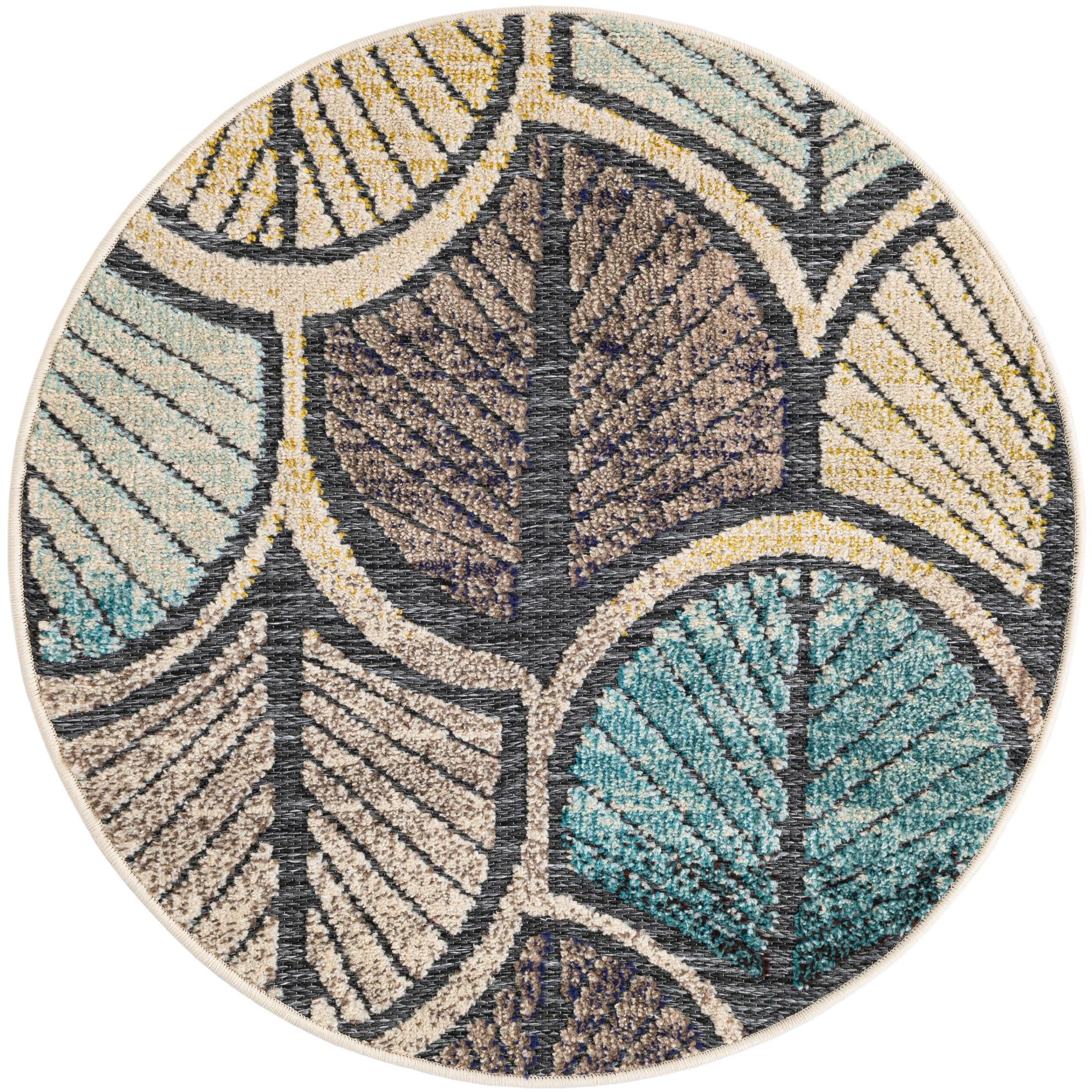 A round gray, blue, and ivory rug with a modern leaf-like pattern, suitable for indoor or outdoor use.