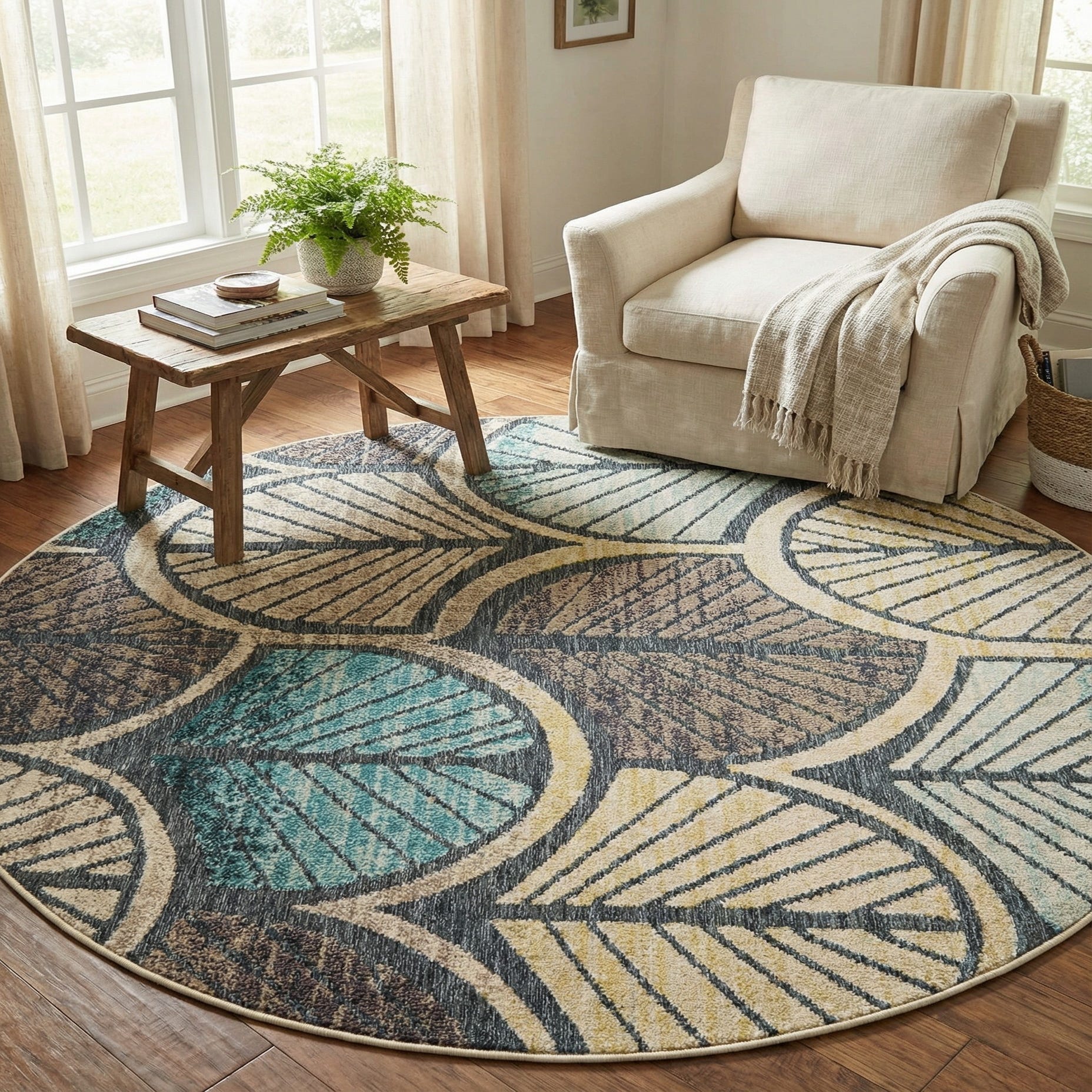 A round Rugs.com Outdoor Casablanca rug featuring a modern leaf pattern in gray, blue, and ivory.