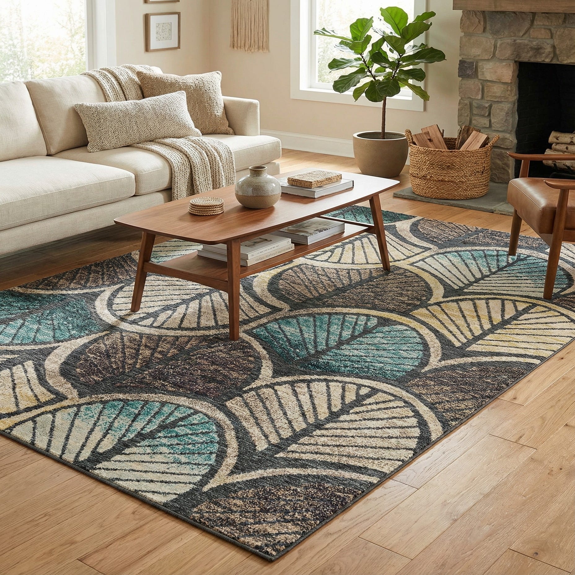 A 6x9 rectangular Rugs.com Outdoor Casablanca rug featuring a modern leaf pattern in gray, blue, and ivory.