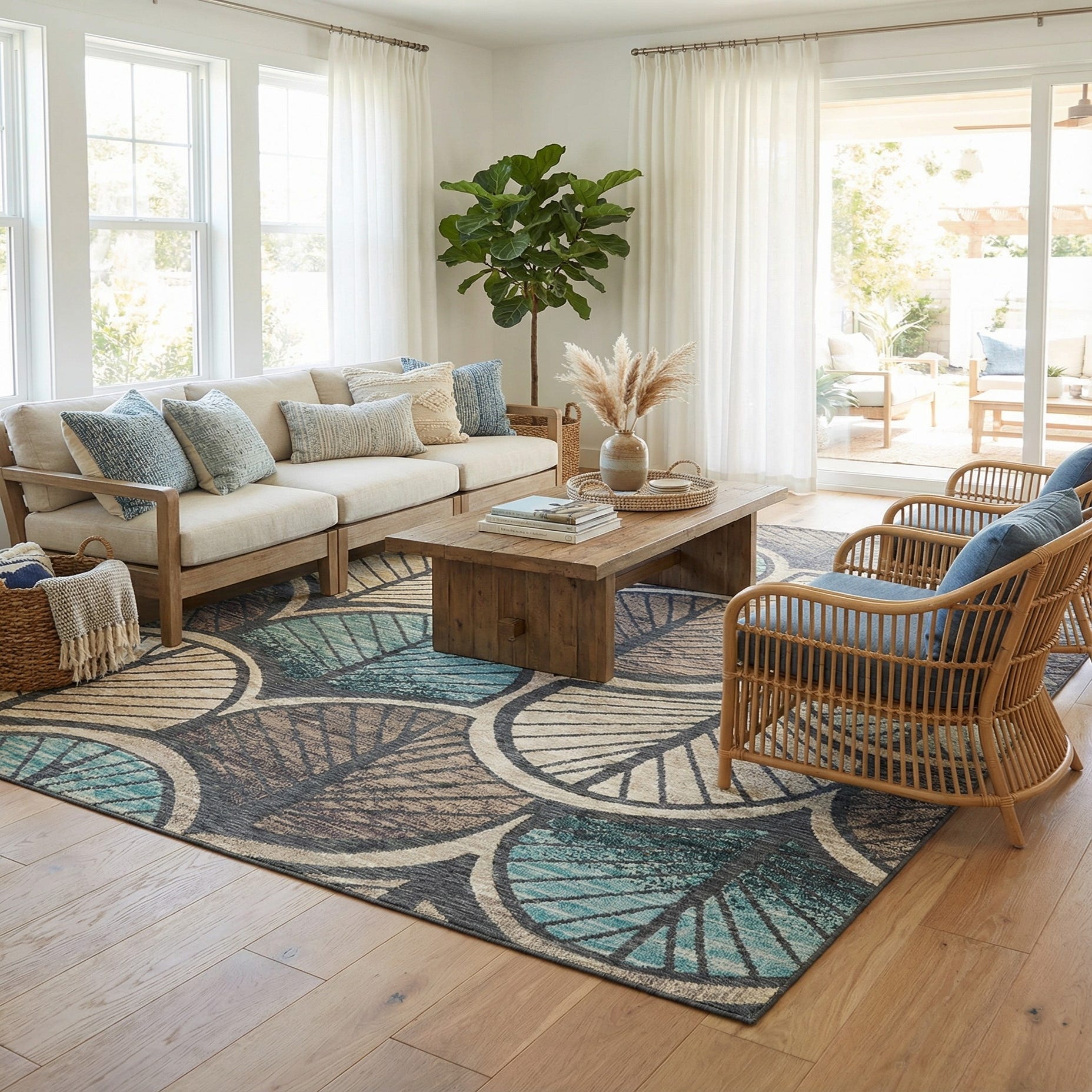 A 9x12 rectangular rug with a modern leaf pattern in shades of gray, blue, ivory, and brown, suitable for indoor or outdoor use.