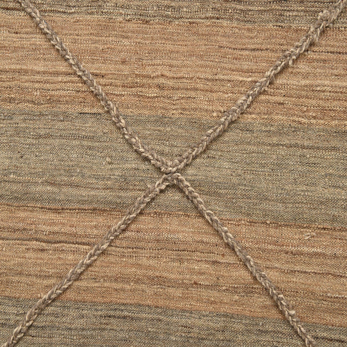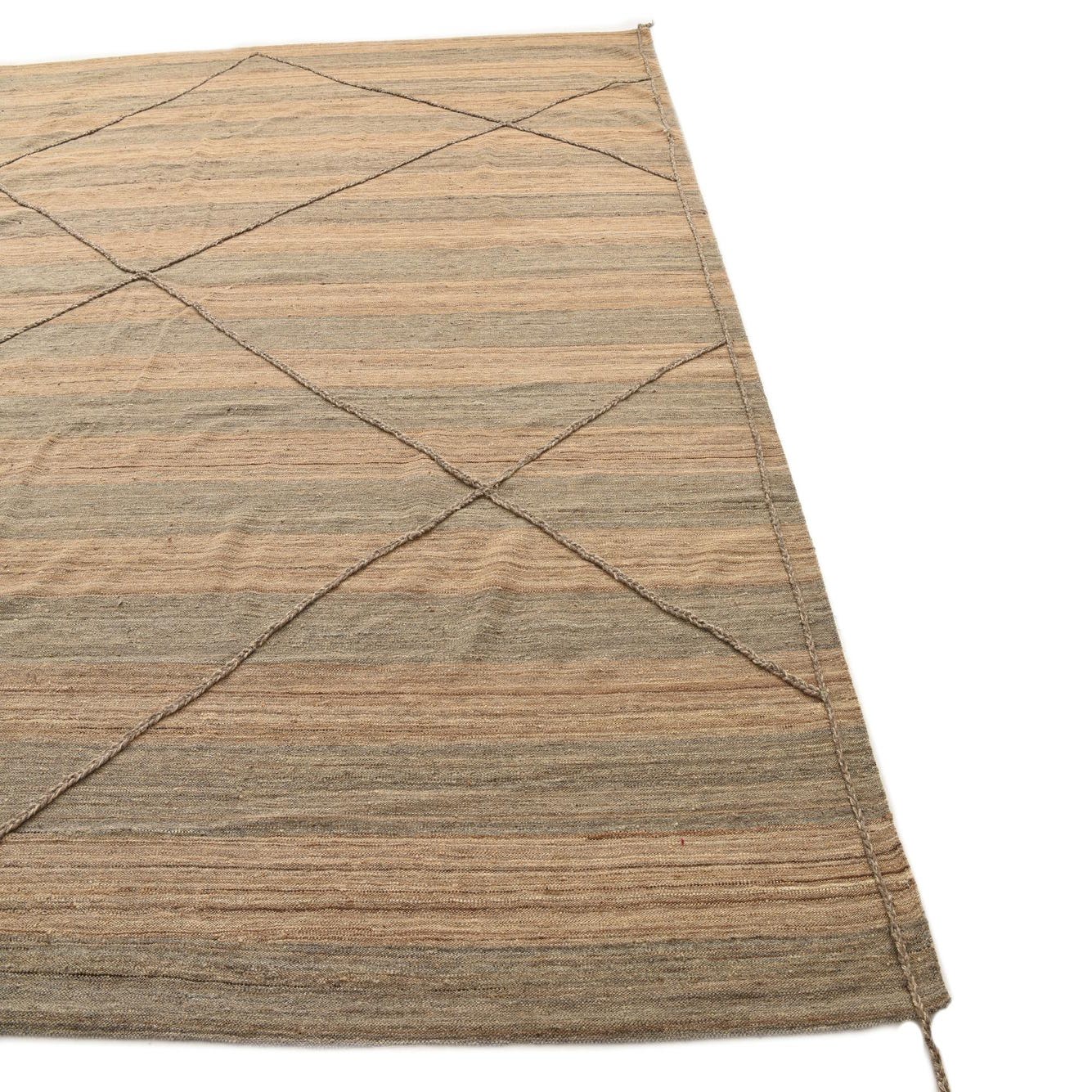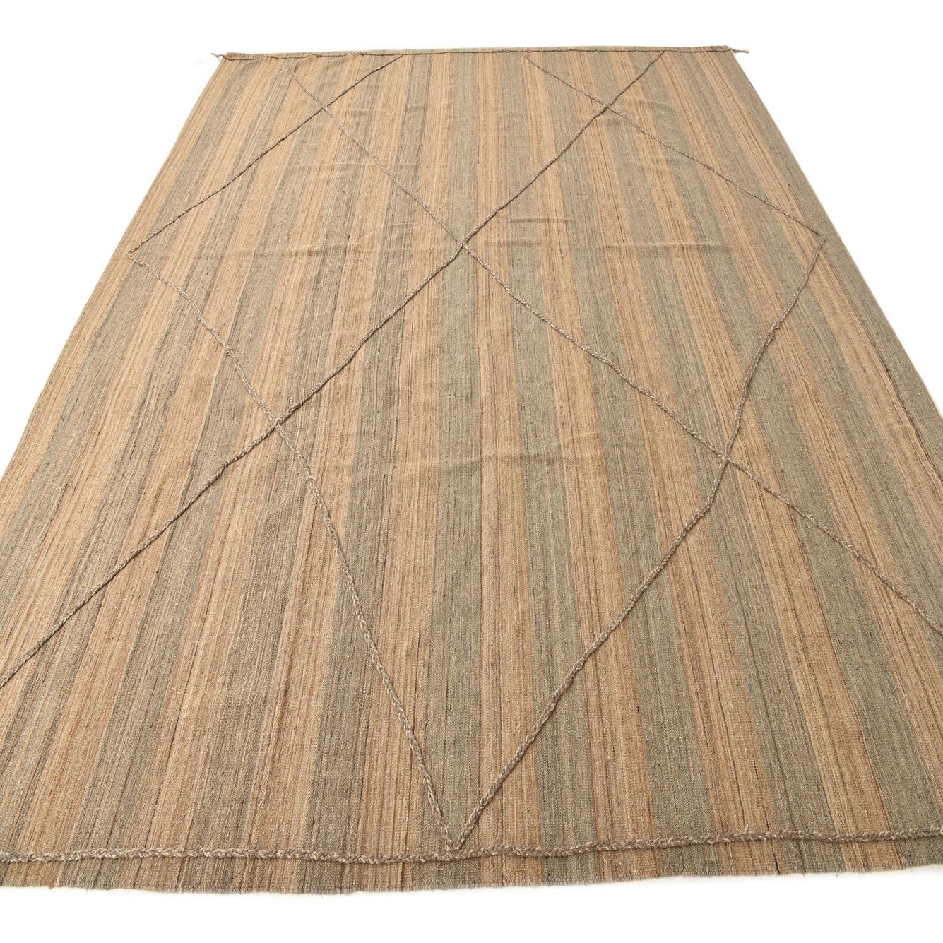 A 10x13 rectangular Moroccan shag rug with alternating brown and gray vertical stripes and a subtle diamond pattern.