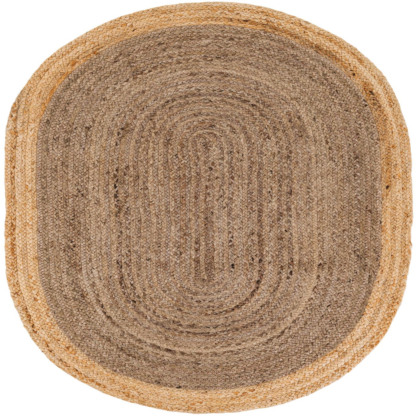 Hand-braided from 100% jute, this oval rug displays the timeless braided pattern of concentric rows that create a low-relief, tactile surface. The main field is a warm gray-brown with natural tonal variation, while a lighter tan braid frames the edge, giving a subtle two-tone effect that reads organic and grounded. The braided construction feels sturdy underfoot with a slightly textured hand that adds visual depth without appearing busy.