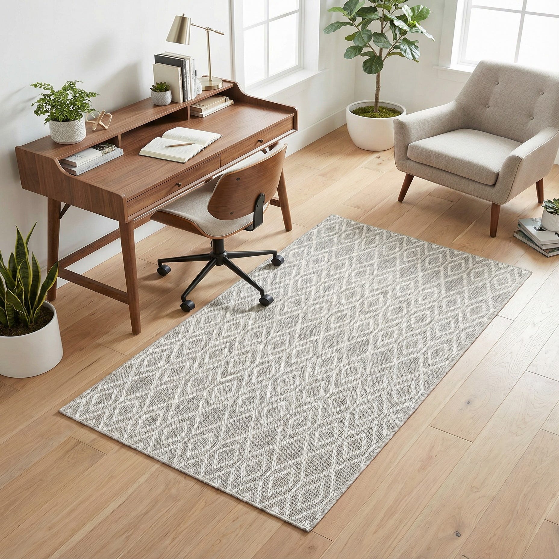 Its neutral palette and geometric style work well in casual and refined settings alike: place it under a small bistro set on a covered patio, anchor a coastal or modern-farmhouse entry with natural woods and linen, or layer it in a sunroom with wicker and muted blues. The understated pattern provides structure without dominating a space, making it easy to coordinate with patterned cushions or solid upholstery.