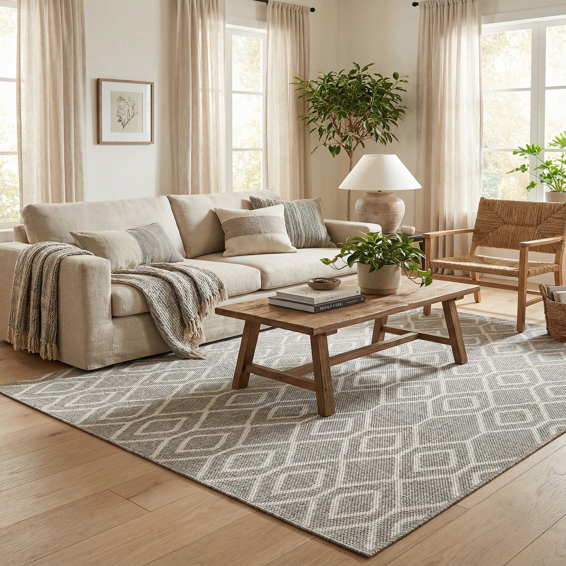 This piece is well-suited to outdoor living areas—covered patios, screened porches, and sunrooms—where its flat weave anchors seating without adding bulk. It also pairs easily with coastal or transitional decor: imagine rattan chairs, linen cushions and a teak coffee table, or use it to ground a simple dining set or entryway with muted, natural accents. The neutral tones make it a good candidate for layering over a larger natural-fiber rug or keeping a minimalist, modern arrangement feeling warm and lived-in.