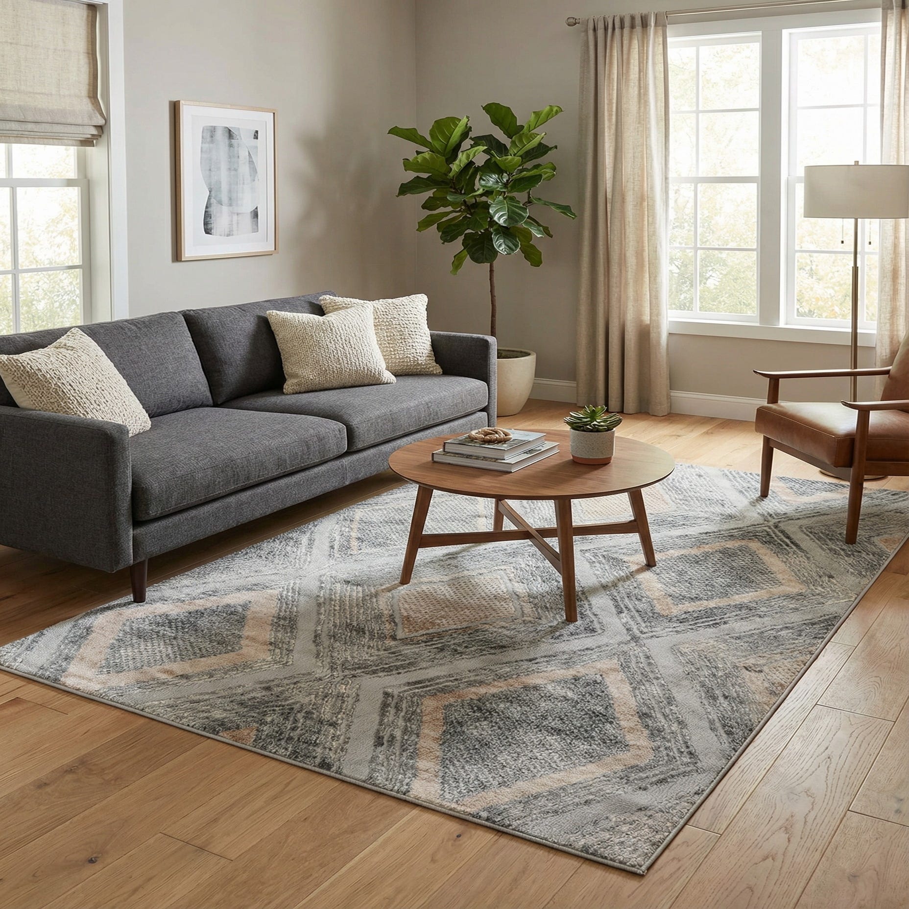 A calming geometric pattern anchors this rug, with repeated diamond medallions set against a Gray Cream background. Each diamond is detailed with tone-on-tone shading in silver and beige, creating a layered, slightly distressed look that reads as soft striations across the field. The surface combines low pile with subtly raised outlines and textured fills, so the rug has a gentle dimensional feel underfoot and a soft, slightly lustrous finish from the polyester fibers. Machine-made of 60% polypropylene and 40% polyester, the construction produces a consistent texture and even color definition throughout the design.