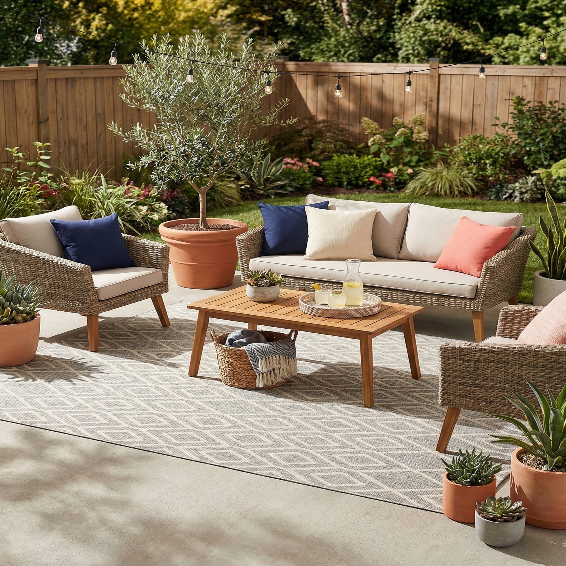 The neutral palette and graphic motif pair easily with wicker or metal patio furniture, a wood dining set on a covered porch, or a light, airy living room scheme with natural linens and greenery. Place it beneath a conversation group to define an outdoor seating area, layer it in a sunroom to add pattern without overwhelming the space, or use it in high-traffic indoor rooms where a calm, contemporary look is desired.