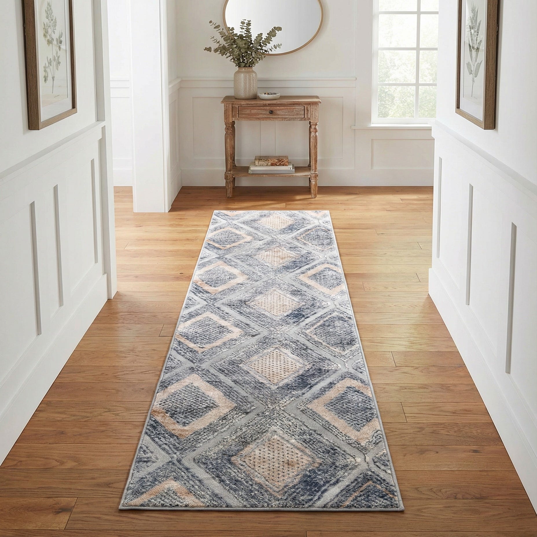 Soft to the touch with a subtly sculpted surface, this runner presents a layered diamond motif in a Gray Cream field with Ivory highlights. The geometric pattern alternates textured centers and shaded borders, creating gentle depth without heavy contrast. Machine made from 60% polypropylene and 40% polyester, the pile offers a dense, resilient feel underfoot and a slightly plush hand that keeps the patterned details defined.