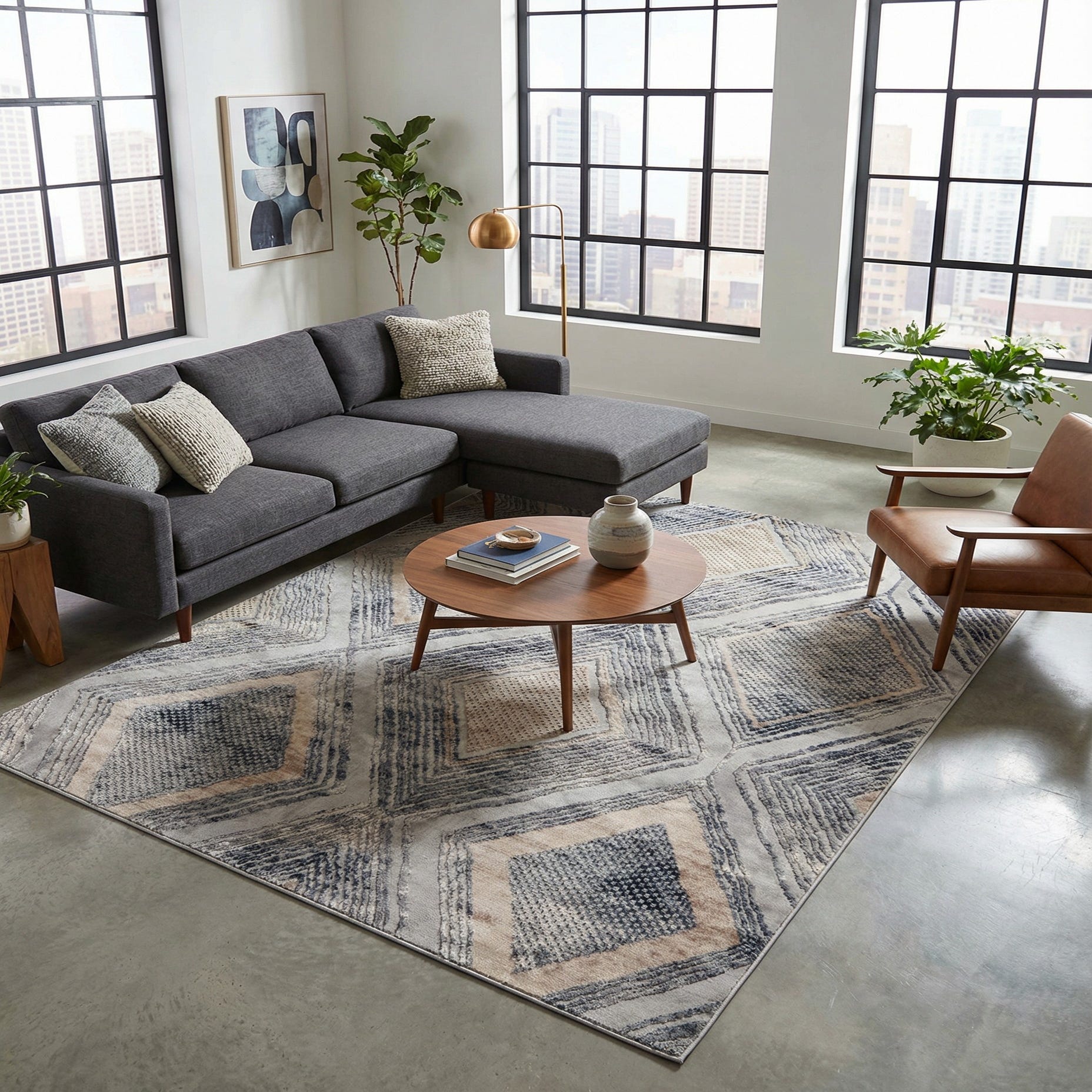 A layered geometric pattern of interlocking diamonds rests on a gray cream background, giving the rug a calm, architectural presence. Striated, sculpted lines in silver and beige radiate from each diamond, while the inner fields show a dense, pebble-like texture that adds subtle contrast and depth. The palette of gray cream, beige, and silver keeps the overall look neutral and versatile, with enough variation to add interest without overwhelming a room.